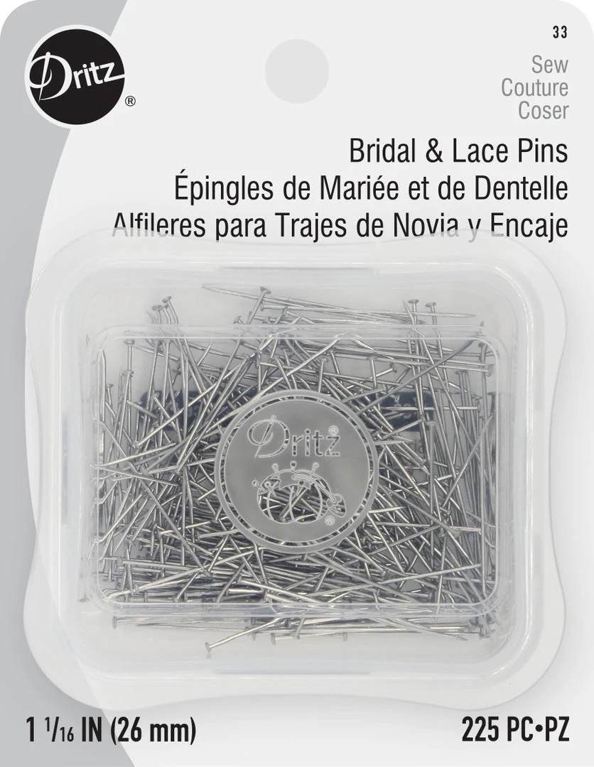 Use Dritz Bridal and Lace Pins for fine or lightweight fabrics and lace. They feature an extra-fine 0.5mm shaft and are rustproof.