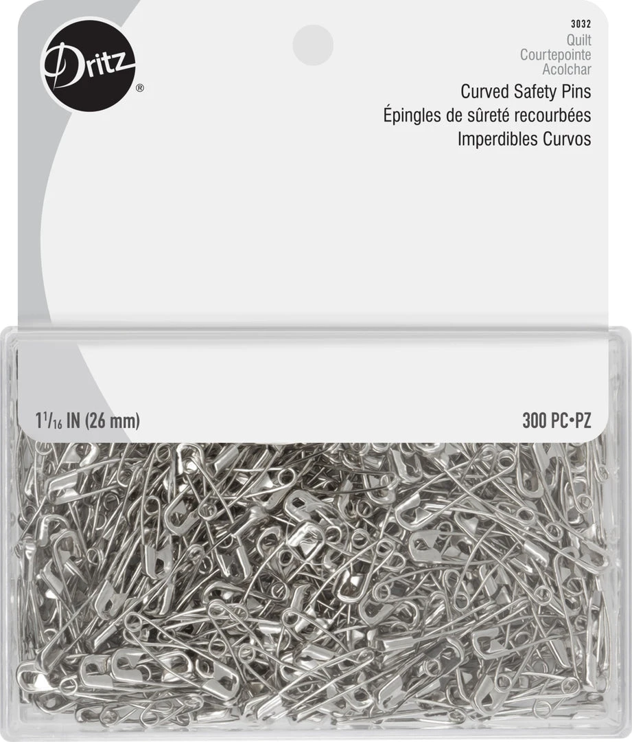 Make quilt basting a breeze with the Dritz Quilting Steel Curved Safety Pin Pack. This pack comes with 300 nickel-plated, steel safety pins that are specially designed for quilt basting. These curved pins are easier to use than the straight pins and come with an accurate angle that helps penetrate through quilt layers without shifting. Packaged in a reusable, clear box, these pins are convenient to store.