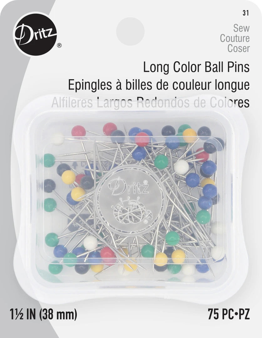 Dritz Long Color Ball Pins are ideal for general purpose sewing and medium weight fabrics. These stainless steel straight pins are rustproof and feature multi-color heads that are easy to see and handle.
