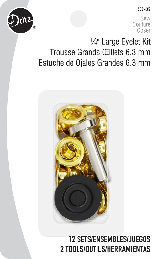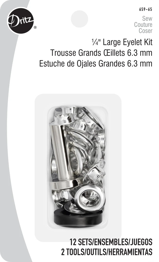Dritz Large Eyelets are a valuable addition to your sewing kit. These eyelets can be used for a variety of sewing or art and craft projects. Use them on belts, vests and jackets, or to create laced effects on your garments. You can even apply them to heavy paper as embellishments for your scrapbooks or handmade greeting cards. Dritz size 1/4″ large eyelets are easy to apply with included hand tools and can also be applied using the Dritz Eyelet Plier Kit, Dritz Eyelet Tool or Dritz Eyelet Kit (each sold separately).