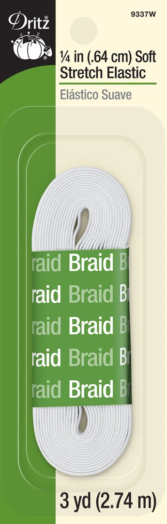 Dritz Soft Stretch Elastic is a lightweight elastic that has a relaxed, softer stretch than traditional braided elastic. The soft stretch features make it suitable for sleeves and necklines that will be next to delicate skin. This slightly ribbed elastic narrows when stretched and is most often used on necklines, sleeves, waistbands, swimwear waistbands and leg bands.
