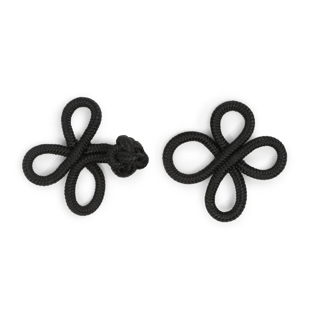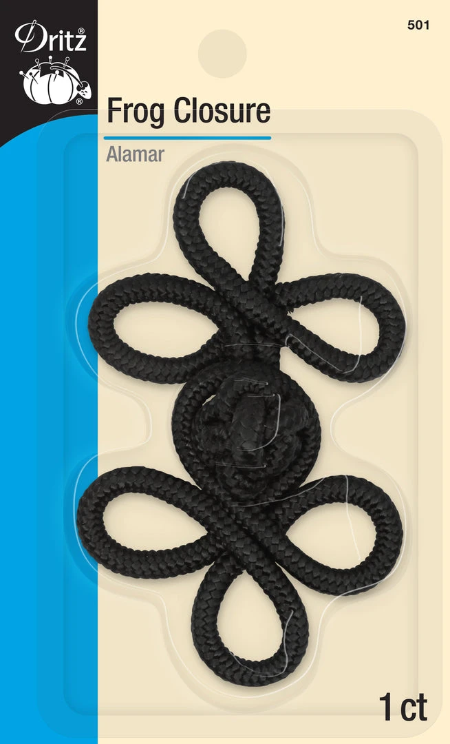 The Dritz frog closures are decorative braided fasteners that also add function to many sewn garments and accessories. These closures are great to use on jackets, vests, bags, and many other items. Simply hand stitch to garment to add a beautiful and functional embellishment. These closures are to be machine washed in cool water and line dried. This package includes a 4-inch Frog Closure set; 100% Nylon.