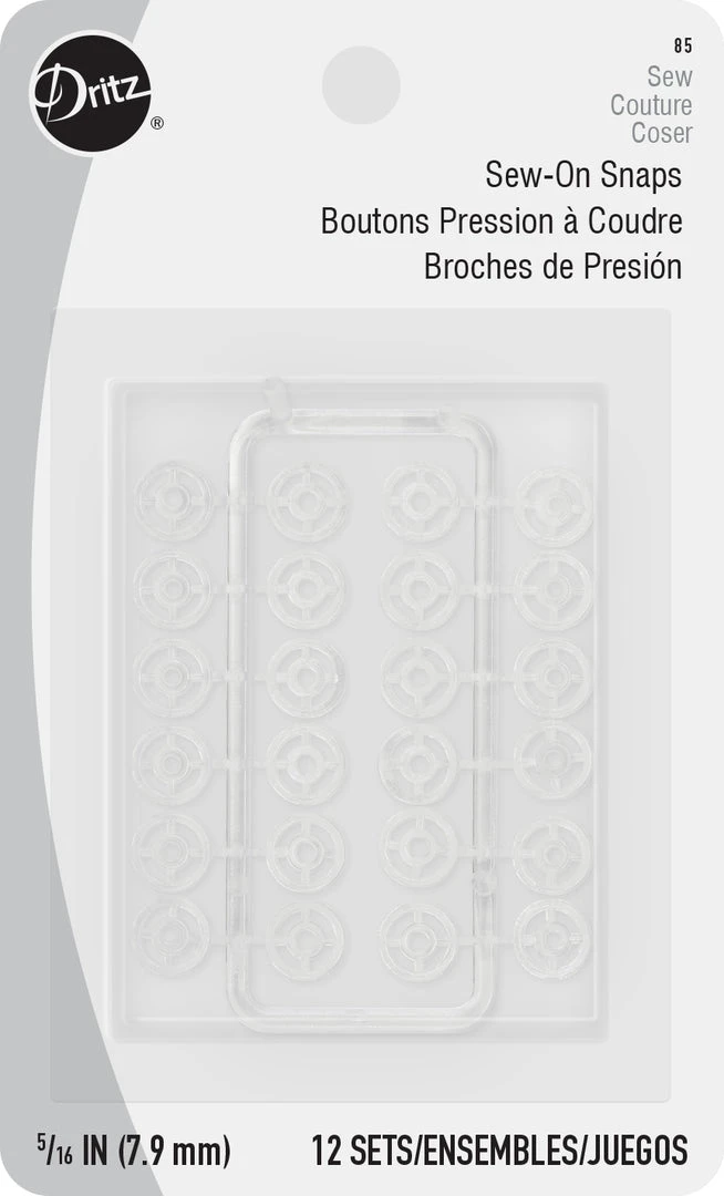 The Dritz Sew-On Snaps are used to hold overlapping edges of fabric together and are ideal for use on clothing and accessories. Perfect to keep on hand because these clear snaps blend with any fabric color. This package contains 12 sets of size 5/16-inch clear sew-on snaps.