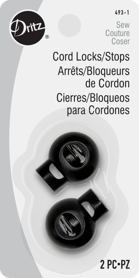 Dritz Cord Stops are the perfect tool to keep drawstrings in place. They not only keep cord ends from slipping into casings, but also add a decorative and finishing touch to your items. This package contains two black plastic cord stops.