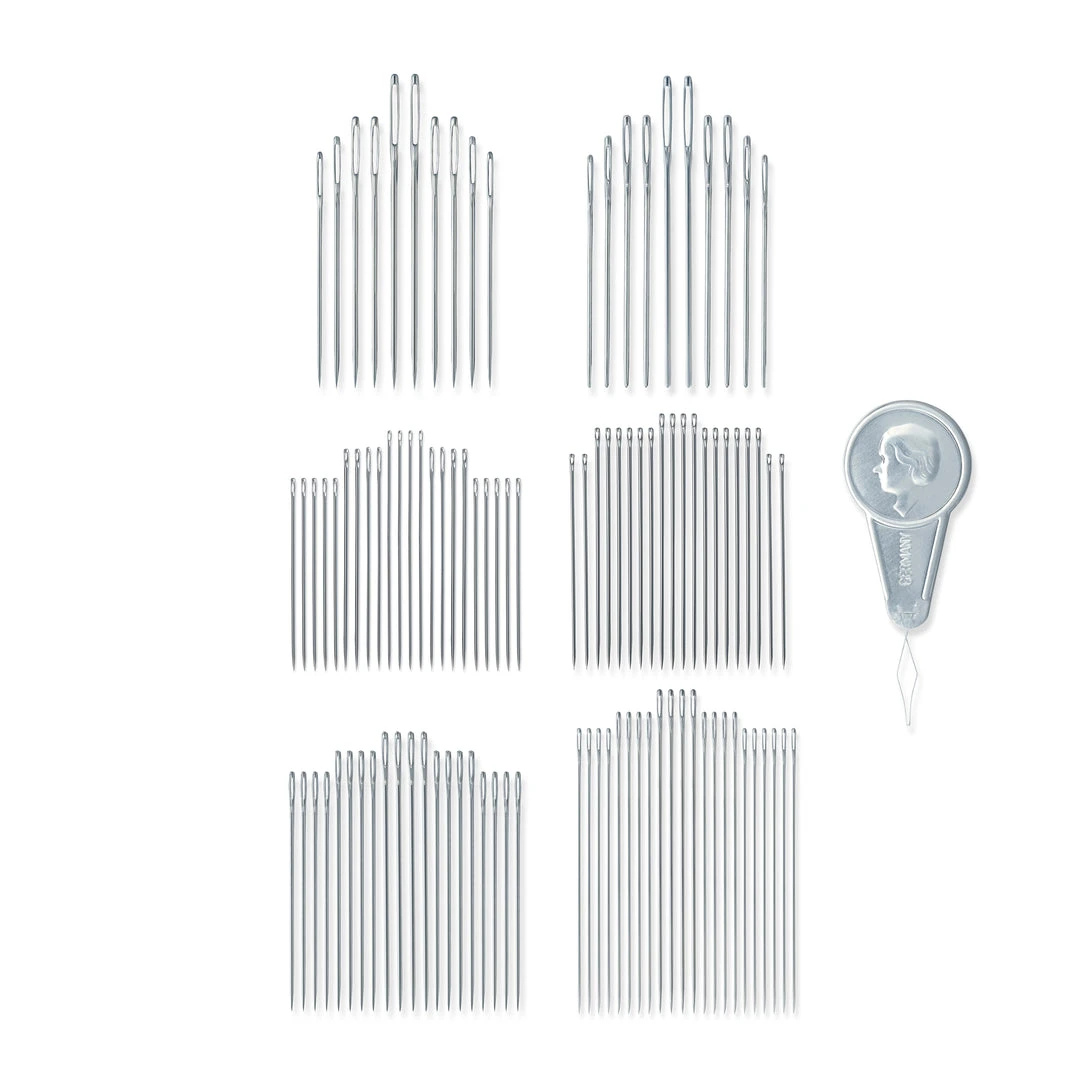 Dritz Deluxe Hand Needle Assortment includes a variety of nickel-plated steel needles and an aluminum needle threader. Needles included in package: Tapestry: 2 Ct. sz 18; 4 Ct. sz 20; 2 Ct. sz 22; 2 Ct. sz 24; Crewel: 4 Ct. sz 3/4; 8 Ct. sz 5/6; 8 Ct. sz 7; 4 Ct. sz 8/9; Betweens: 4 Ct. sz 4/5; 8 Ct. sz 6/7; Sharps: 4 Ct. sz 4/5; 12 Ct. sz 6/7; 4 Ct. sz 8/9; Chenille: 2 Ct. sz 18; 4 Ct. sz 20; 2 Ct. sz 22; 2 Ct. sz 24; Darners: 4 Ct. sz 5; 8 Ct. sz 7; 8 Ct. sz 9