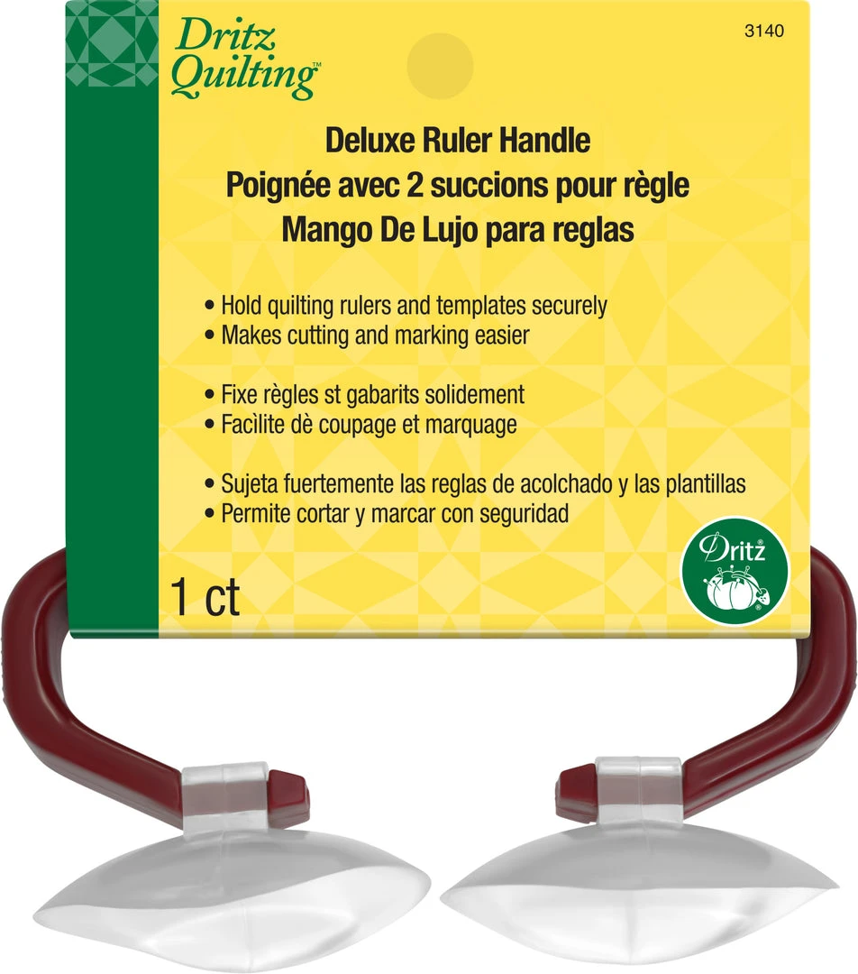The Dritz Deluxe Ruler Handle features two suction cups that lets you get a secure grip on your quilting rulers and templates. It attaches easily, and helps prevent slipping. This ruler handle makes cutting and marking easier and more accurate. It is especially great for steadying your ruler when using a rotary cutter. These powerful suction cups are soft, and will not damage your ruler. This pack contains one deluxe ruler handle.