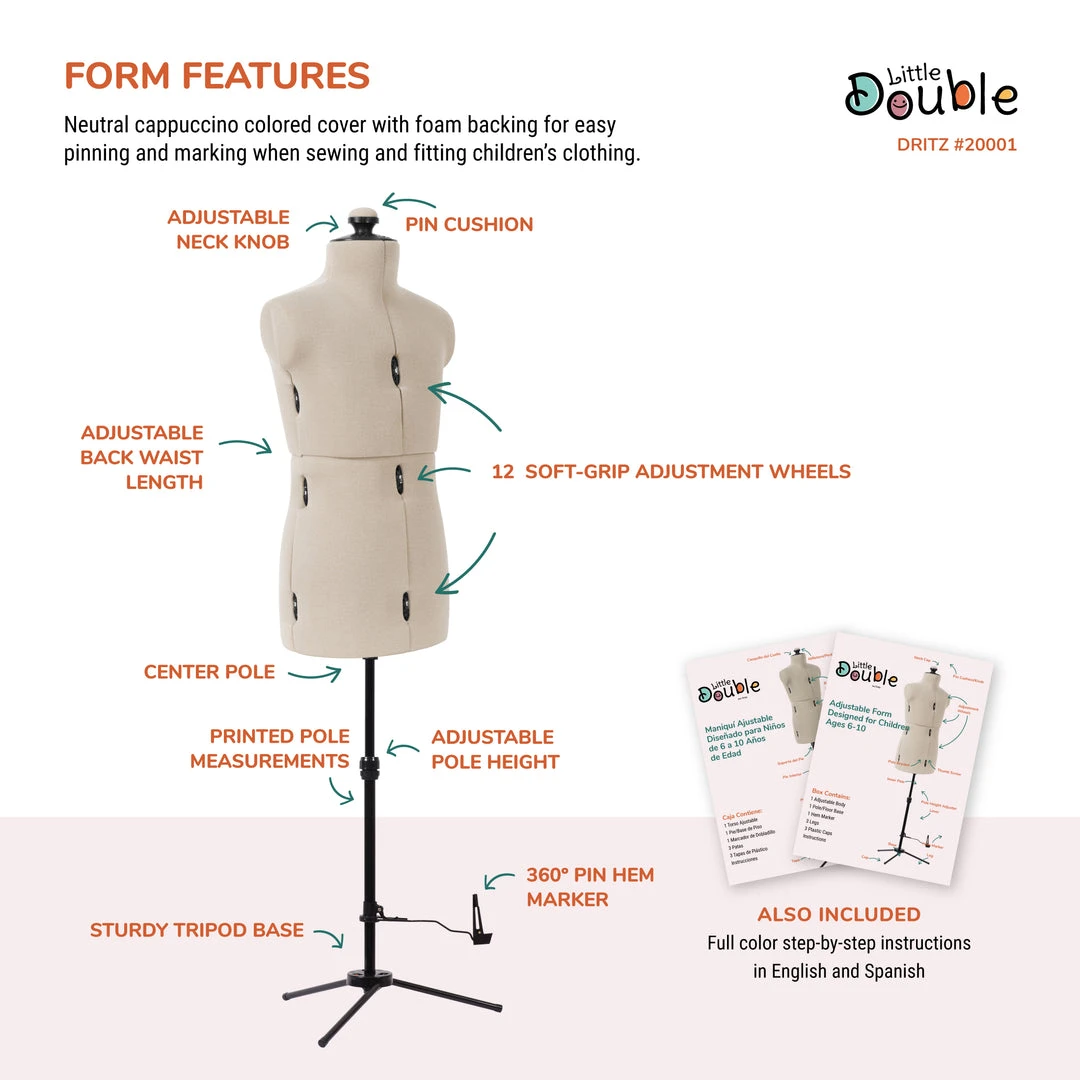 Dritz Little Double adjustable form is designed to assist in the sewing and fitting of children’s clothing. The body sizing and proportions are best suited for girls and boys in the 6 to 10 years age range.
