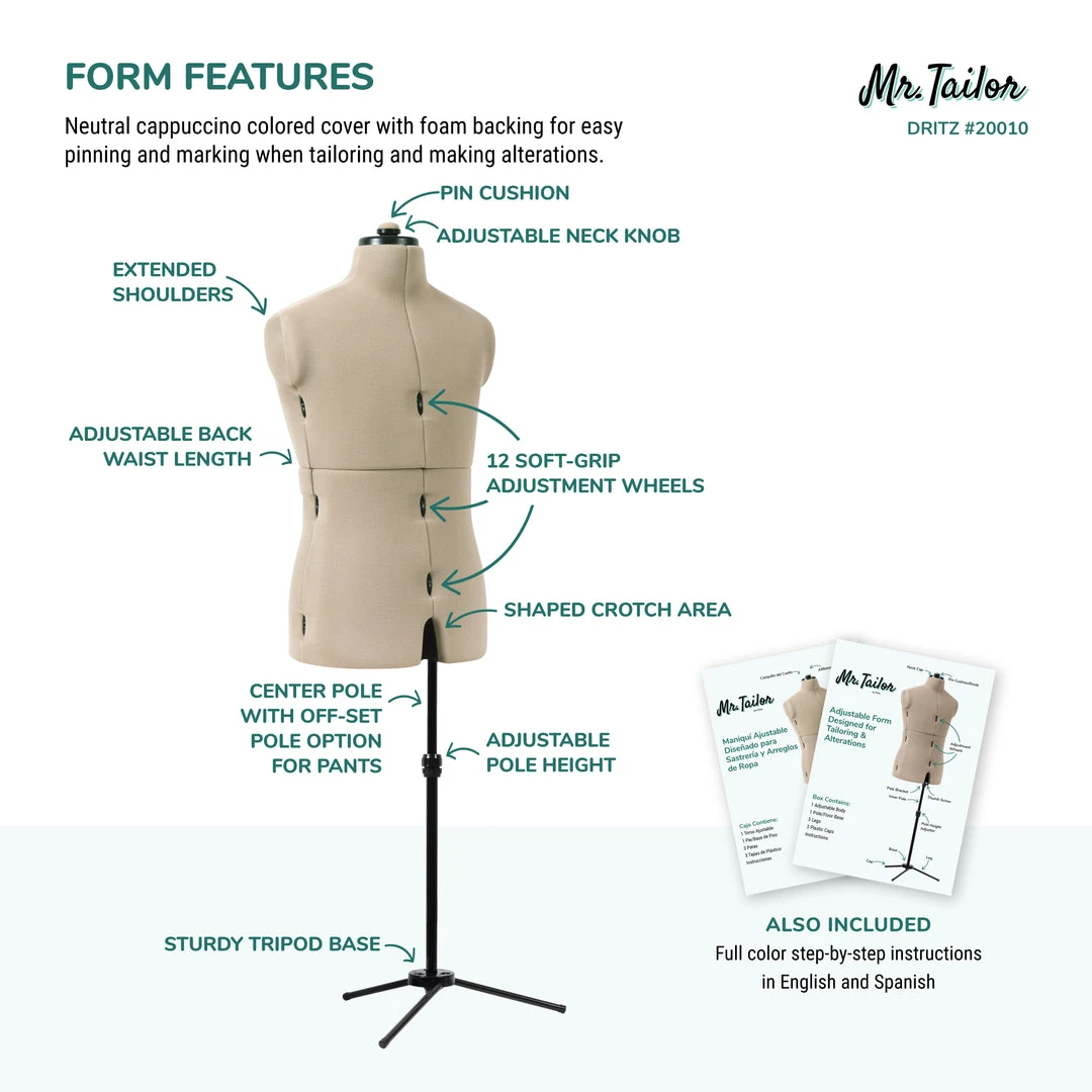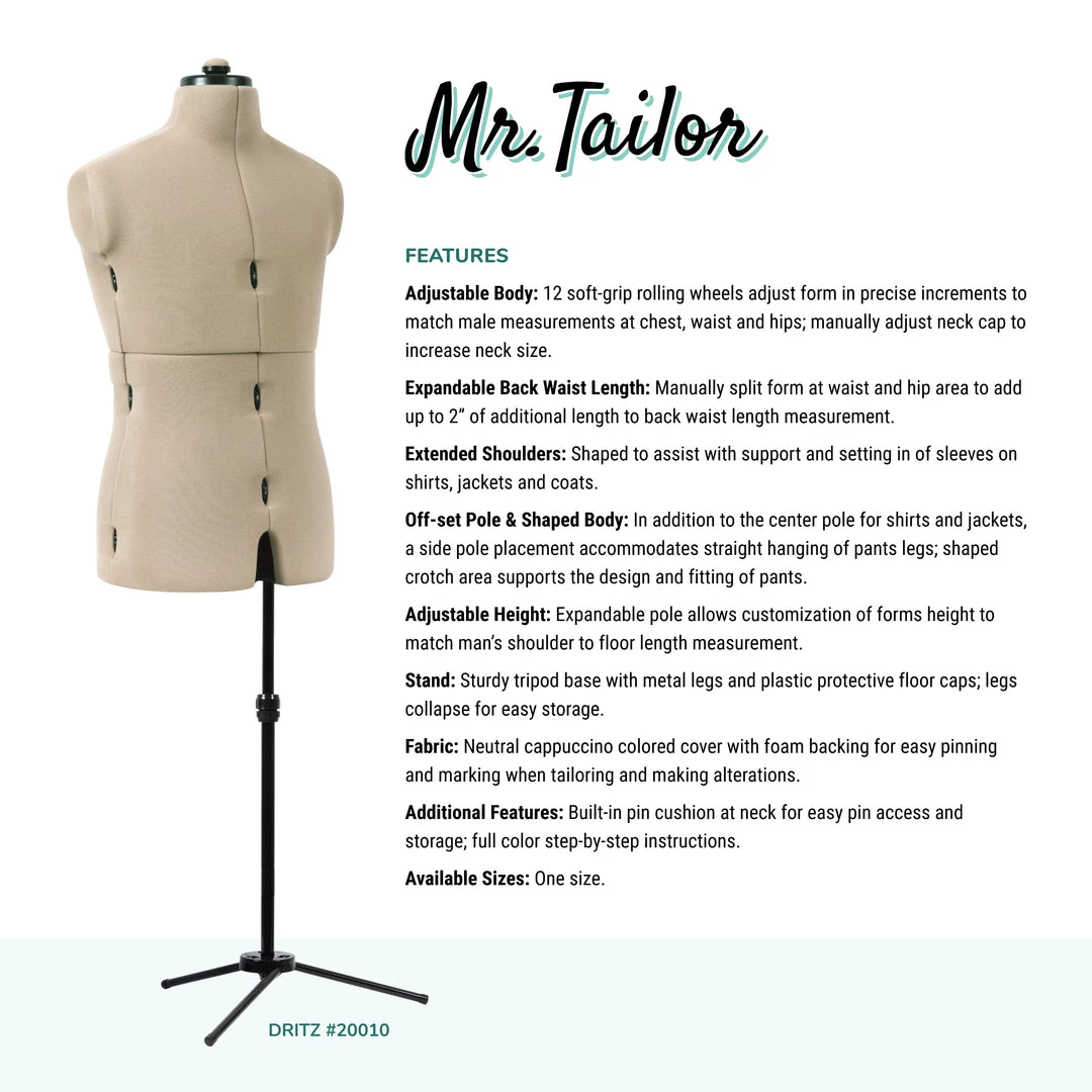 The Dritz Mr. Tailor adjustable male form has a unique design and special features to assist you when tailoring and altering men’s pants as well as shirts and jackets.