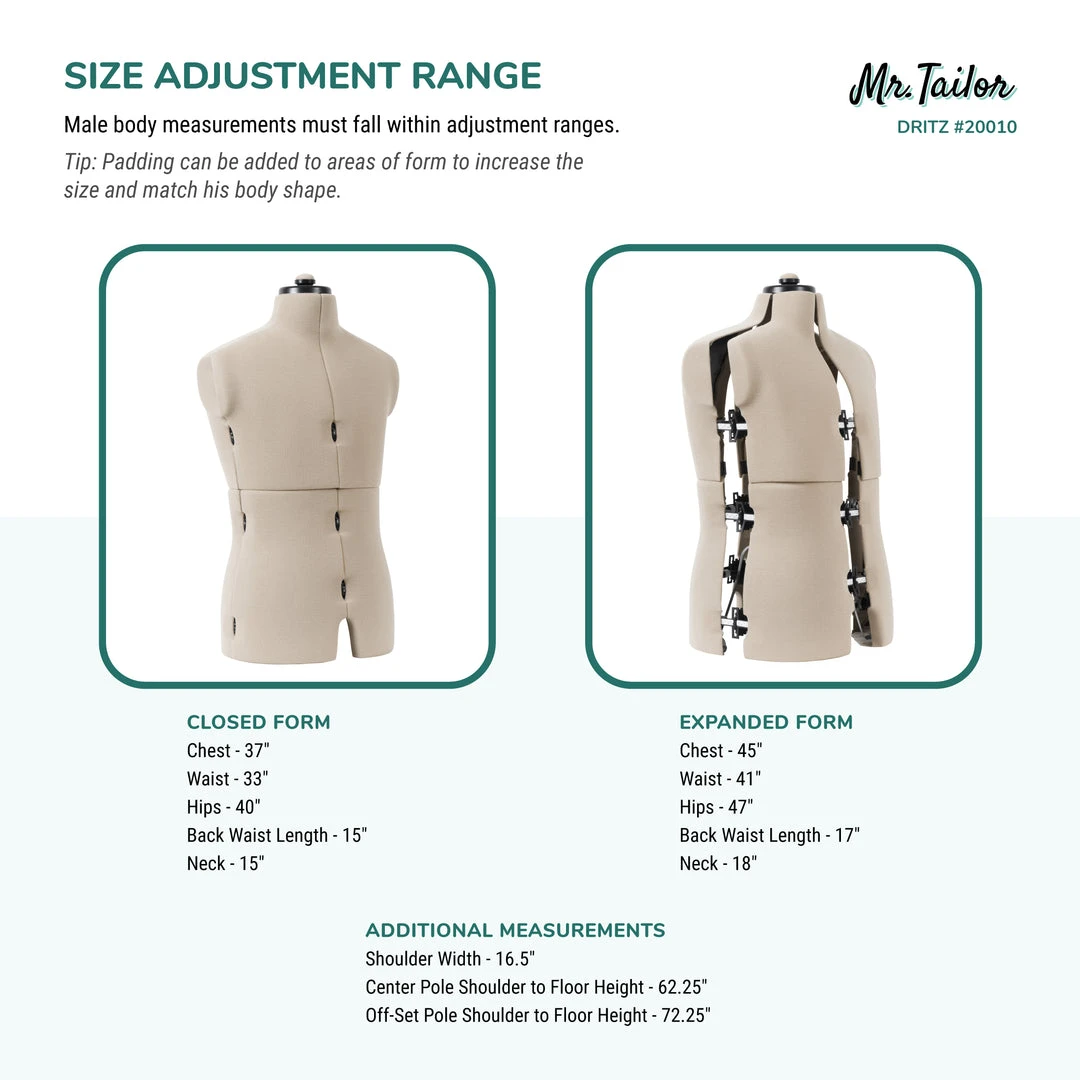 - Adjustable Height: Expandable metal pole allows customization of form height to match man’s shoulder to floor Length measurement