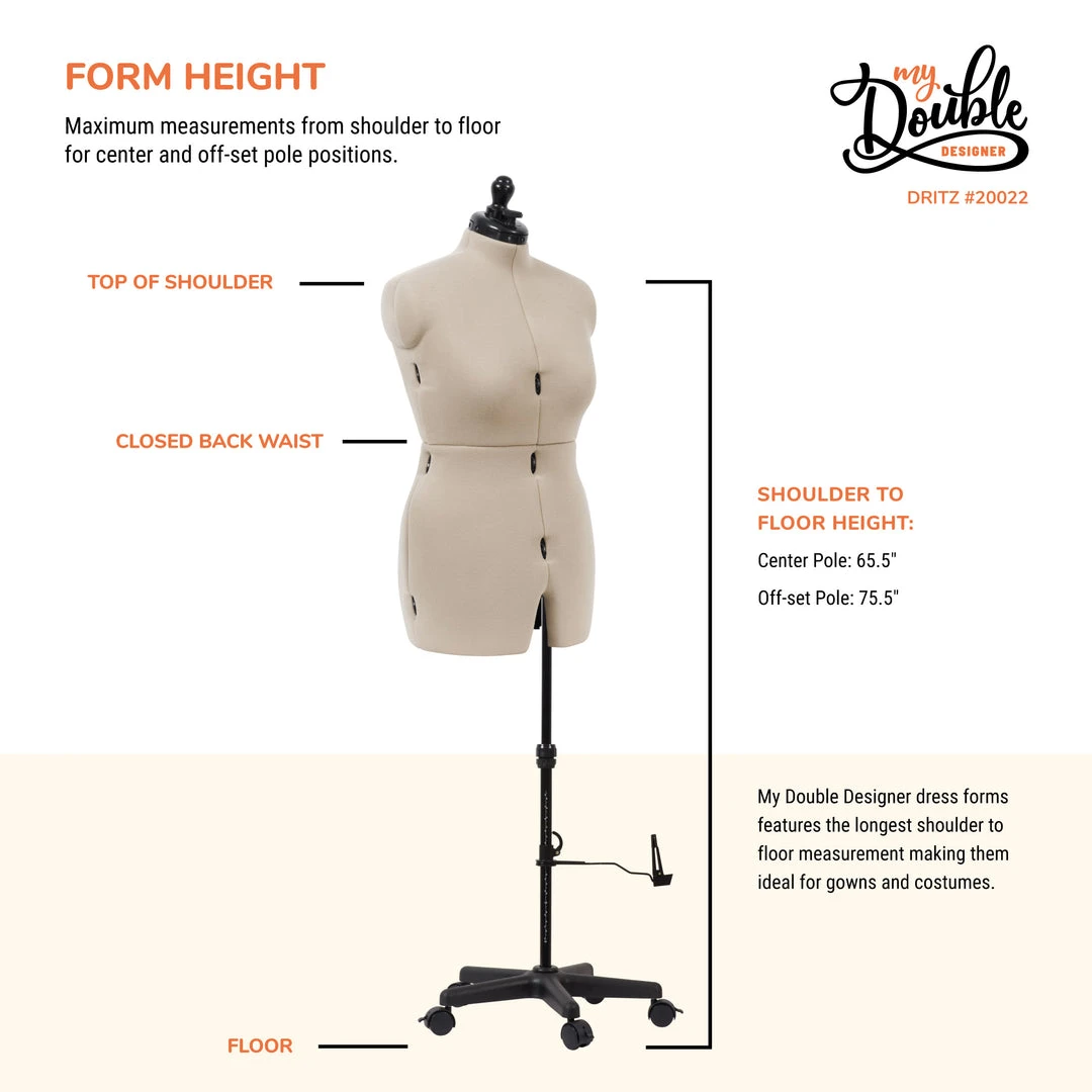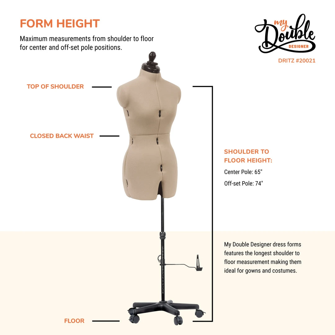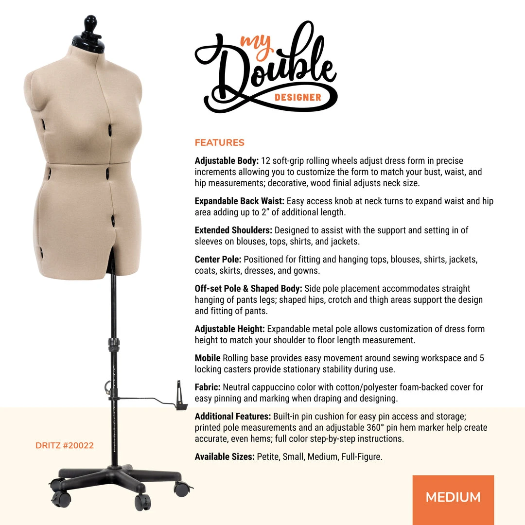 The Dritz My Double Designer Dress Forms help you fashion a double of your body providing you with professional looking garments. Use the form to audition fabrics and test the drape and overall look and feel before you start your project. The form is ideal for checking the fit of your pattern tissues and garment test muslin. The form assists with modifications and alterations to both new construction and ready-to-wear clothing that requires modifications. The forms fabric is a neutral colored cotton/polyester with foam-backing for easy pinning and marking when draping and designing.