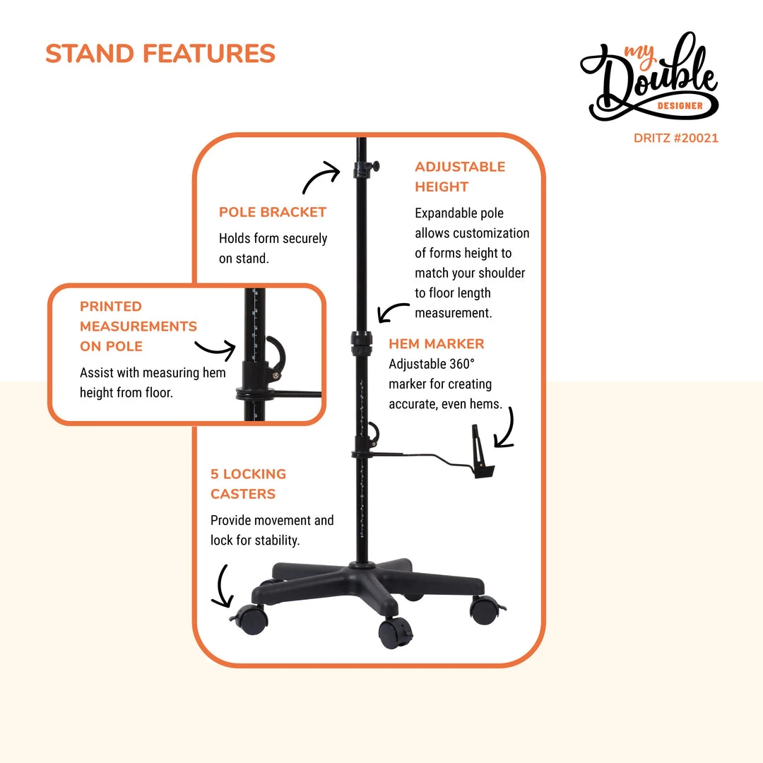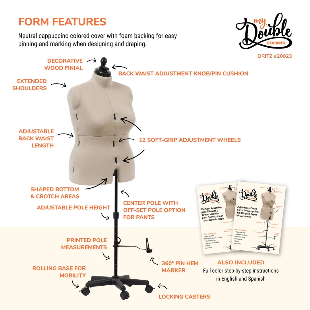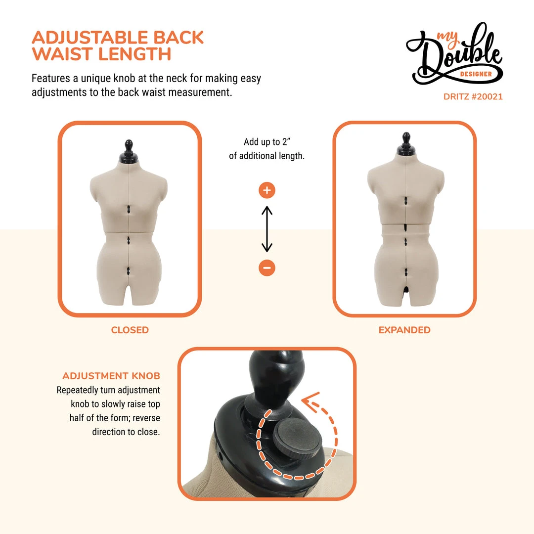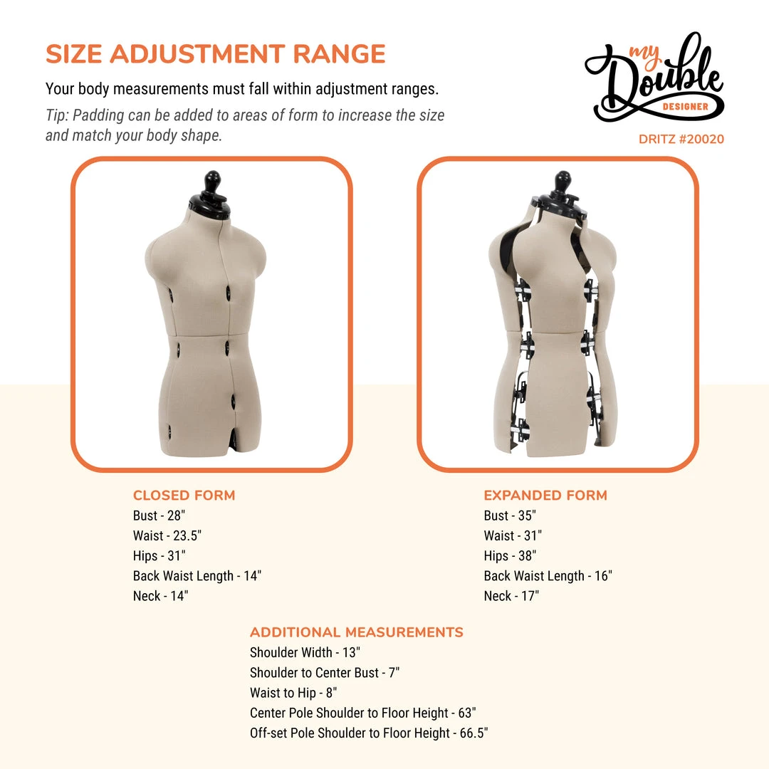 The Dritz My Double Designer Dress Forms help you fashion a double of your body providing you with professional looking garments. Use the form to audition fabrics and test the drape and overall look and feel before you start your project. The form is ideal for checking the fit of your pattern tissues and garment test muslin. The form assists with modifications and alterations to both new construction and ready-to-wear clothing that requires modifications. The forms fabric is a neutral colored cotton/polyester with foam-backing for easy pinning and marking when draping and designing.