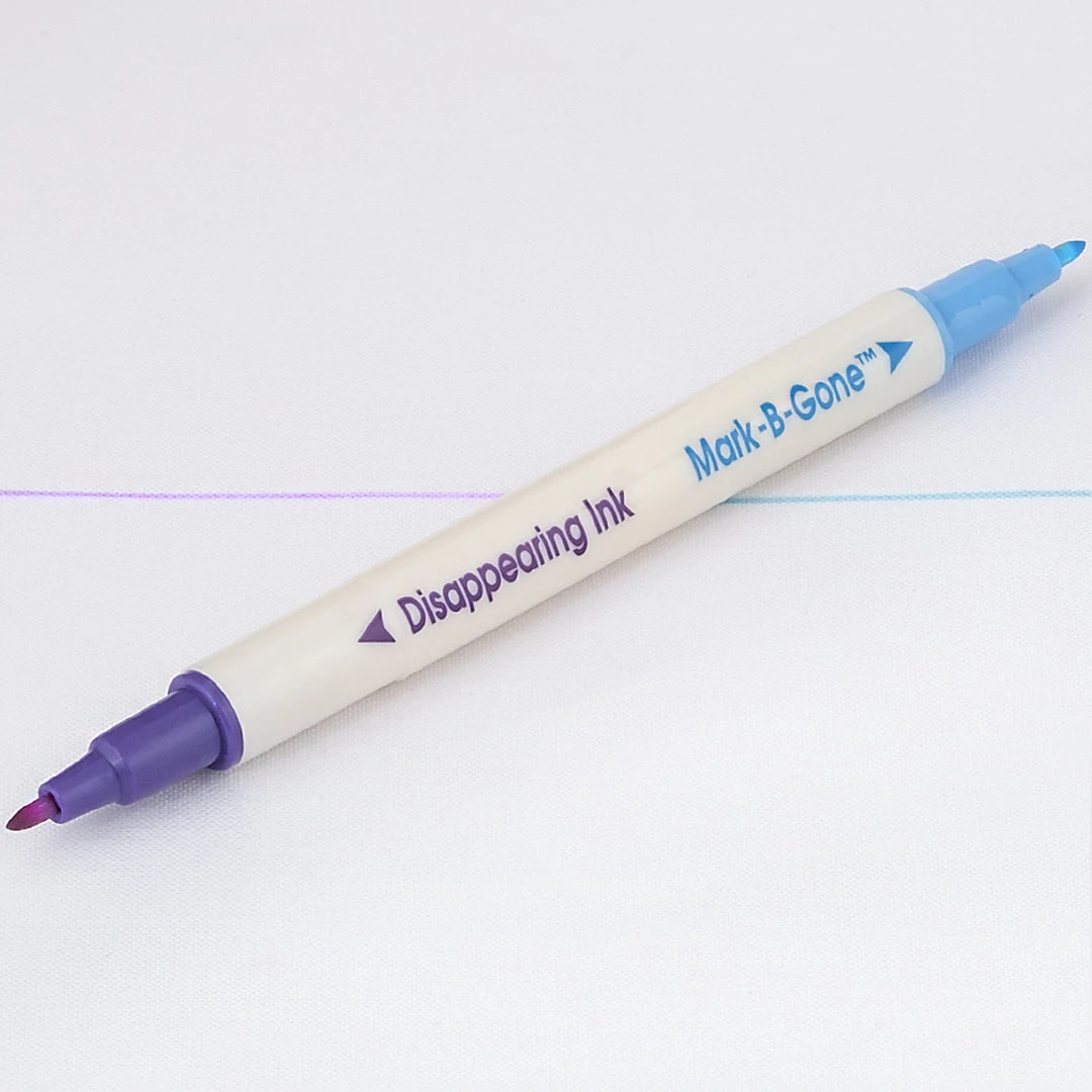 This Dual Purpose Marking Pen by Dritz features a Blue Mark-B-Gone Pen on one end and a Purple Disappearing Ink Pen on the other. Use this pen to transfer pattern markings, needlecraft, quilting designs and more. The blue ink wipes off with a damp cloth while the purple ink is air and water soluble.