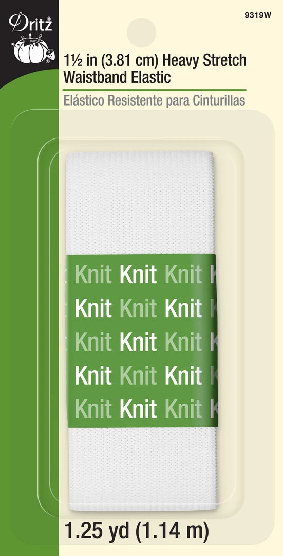 Dritz Heavy Stretch Waistband Knit Elastic is a strong, stiff stretch elastic for heavier fabrics. It is great for cuff bands, waistbands and jacket waistbands.