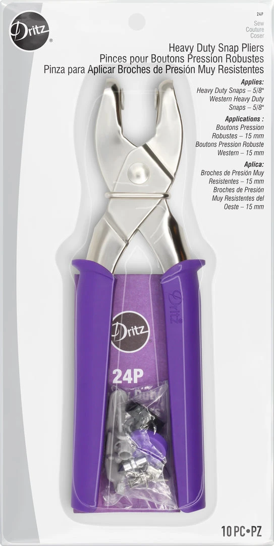 Dritz heavy duty snap pliers are used to apply functional heavy duty snaps to a variety of DIY sewing and repair projects such as jackets, coats, skiwear, and boat covers.