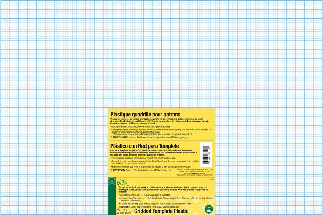 Use this Dritz Gridded Plastic Template for making applique patchwork or quilt templates. Draft template shapes directly on plastic using grid markings. This plastic template is translucent for positioning templates on fabric. Cut with scissors, rotary cutter or craft knife. This pack includes one 12 x 18-inch Gridded Plastic Template.