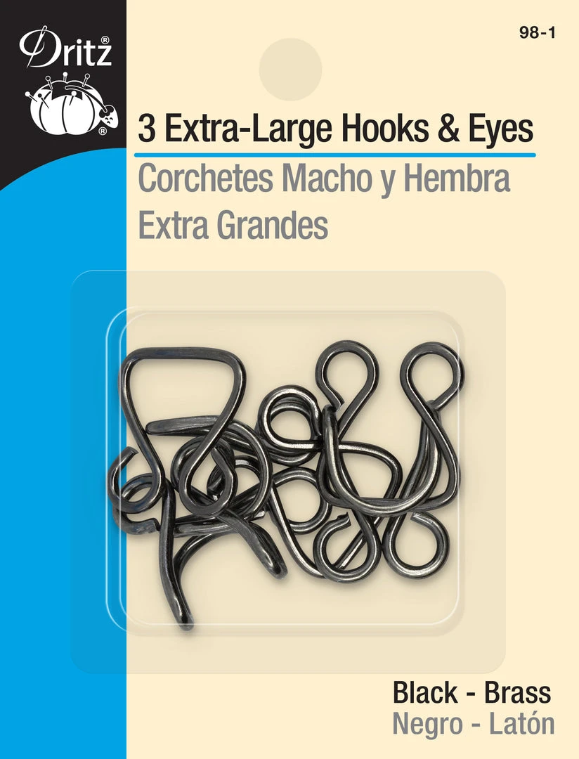 The Dritz Extra-Large Hook & Eyes Pack of 3 is a useful addition to your sewing kit. This package includes three extra-large metal hook and eye sets, which are available in a plenty of optional colors. These hook and eyes act as closures that hold finished edges together. Ideal for waistbands of skirts and pants, they are durable and easy to work with. You can even use these extra-large hook and eyes on top of your dresses and blouses.