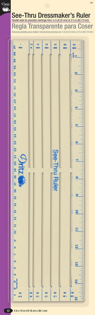 Dritz See-Thru Dressmaker’s Ruler 4” x 15” is a must-have tool in every fabric designer’s kit. Accurate numbering on this scale aids in making precise markings from 1/4 to 3-3/8 inches. The scale also features a lightweight plastic material to facilitate parallel markings. It is great for measuring and marking specific locations of buttons, appliques, lace, pockets, buttonholes and can also be used as a tracing wheel guide.