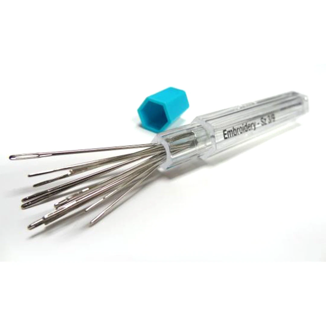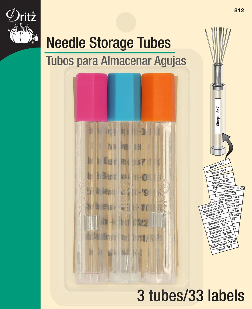Dritz needle storage tubes with labels are a handy accessory for identifying and storing hand needles for sewing and quilting; magnetized tube easily dispenses needles for use.