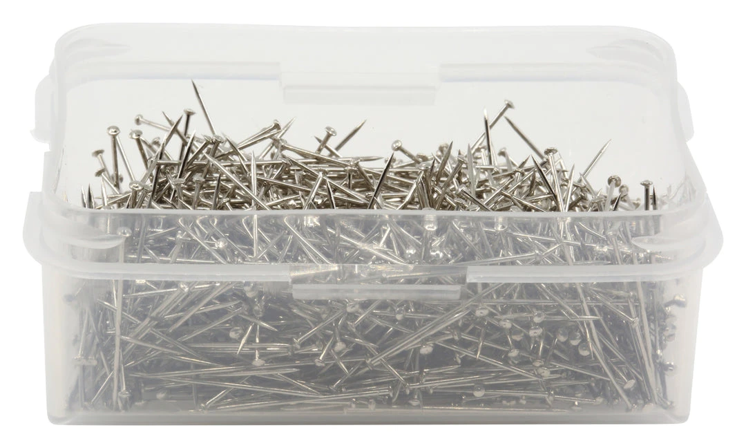 - Pins are housed in a stackable plastic storage box that has a curved side for easy pin removal