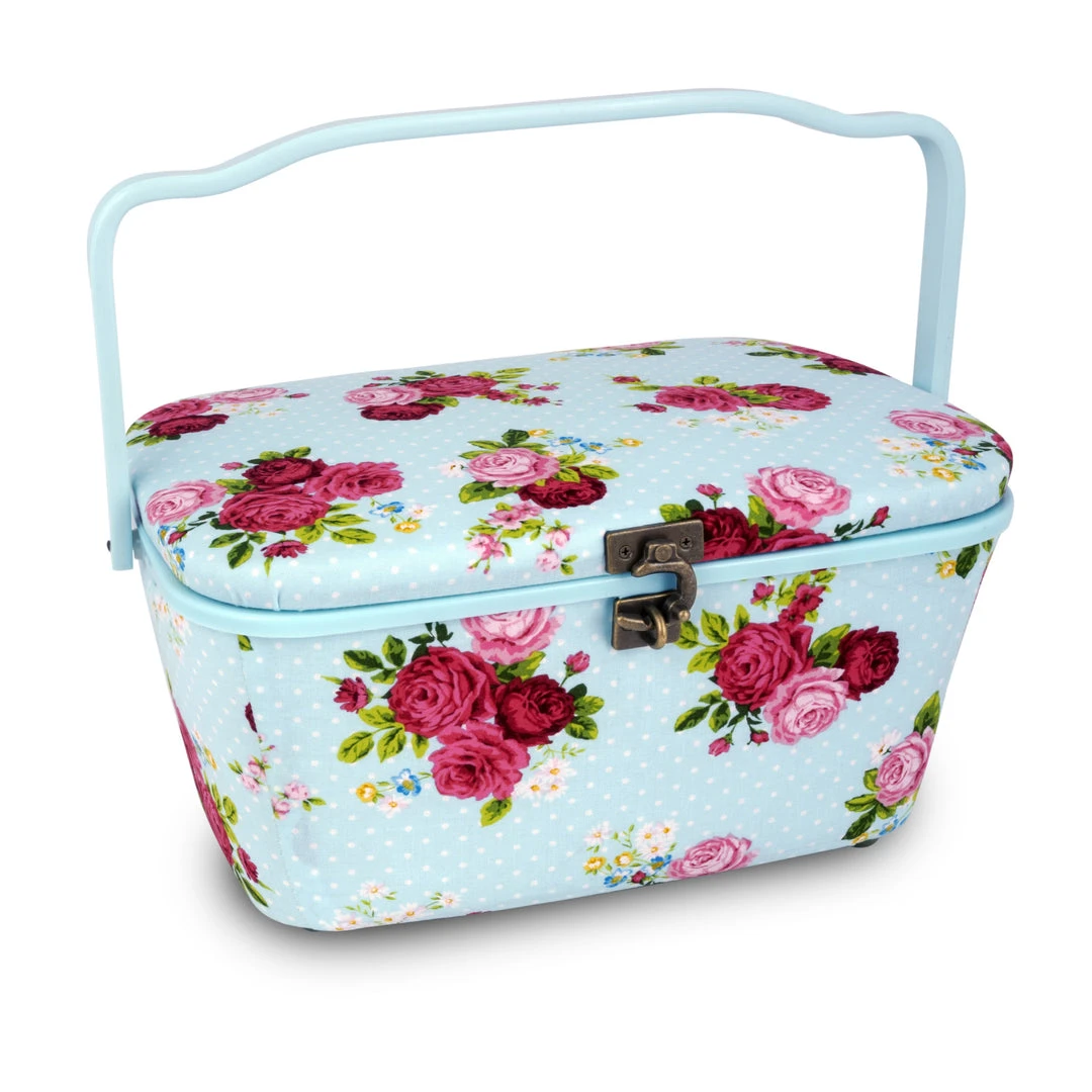 A Dritz sewing basket is an attractive way to organize essential sewing, quilting or craft supplies for at home or on-the-go. This fabric covered sewing basket features pretty clusters of roses on an aqua blue background with dainty white dots. The large size is ideal to keep supplies close at hand.