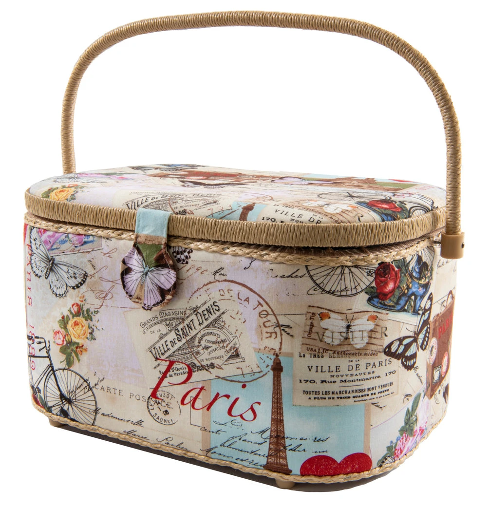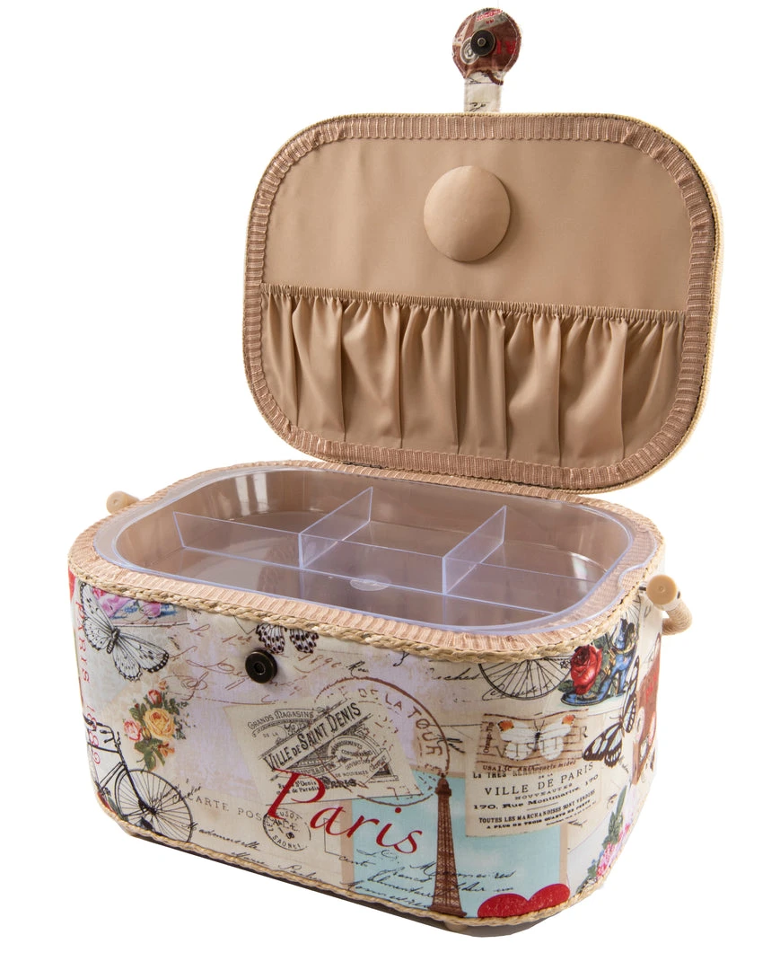 This extra large oval Dritz sewing basket features a Paris postcard print. Beige trim, handle and lining. It is an attractive, portable solution for storing and organizing essential sewing, quilting or craft supplies.