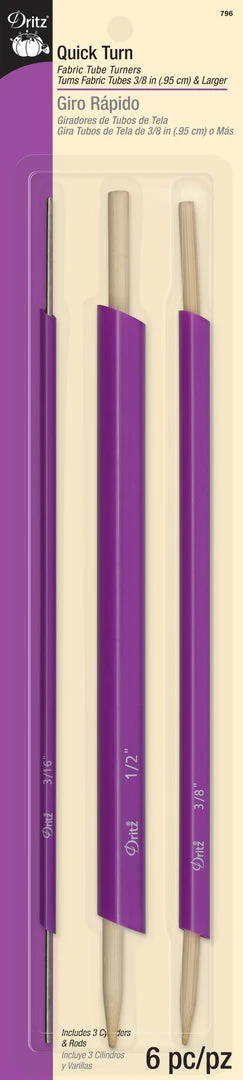 Quick Turn comes with 3 sizes of plastic cylinders and wooden rods used to push and turn fabric tubes quickly and easily.