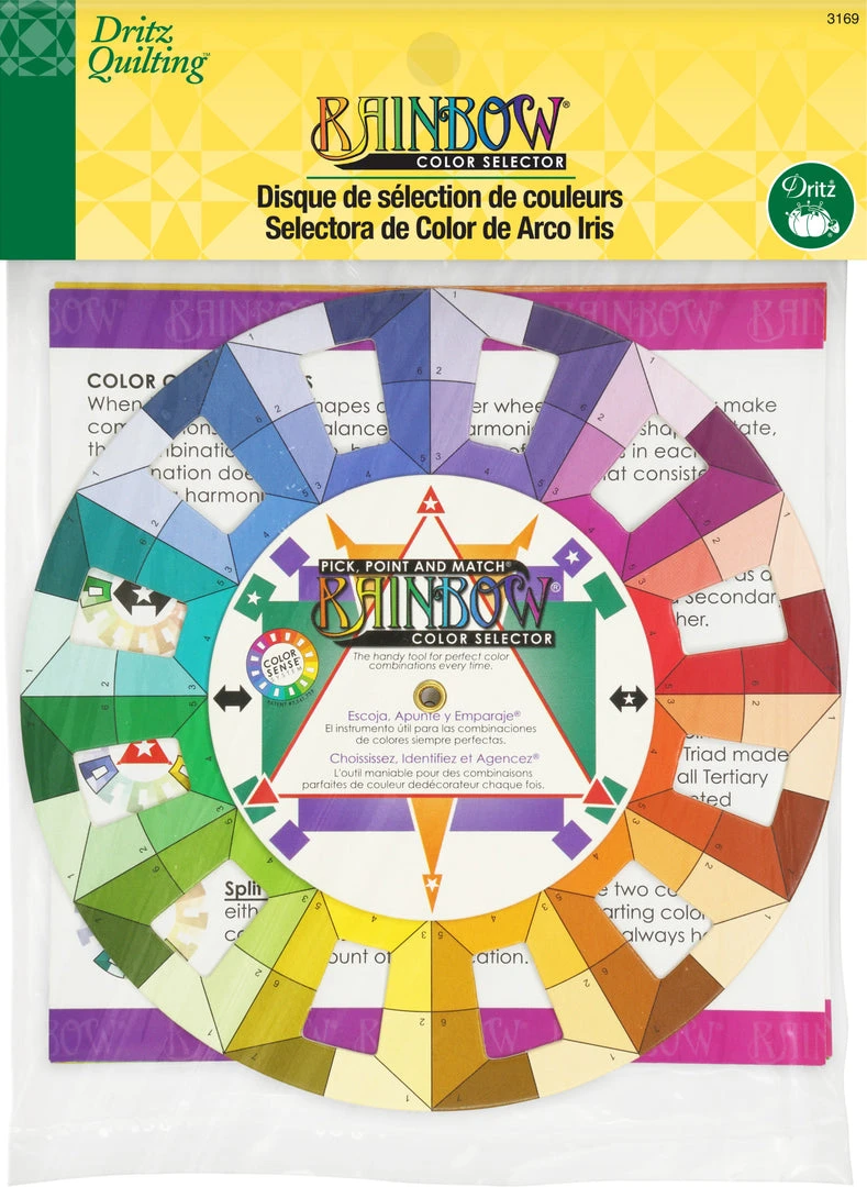 Dritz Quilting Rainbow Color Selector is a unique product that helps you coordinate colors for your quilted masterpieces. This package contains the quilting rainbow color selector and an instruction leaflet with complete and illustrated directs. Choose a desired color and use the color wheel guide’s coordinating arrows to help you create ideal color combinations for all your creative projects. It works with fabric and fibers for quilts, knits, needlework, crochet, scrapbooking, card making and other craft projects.