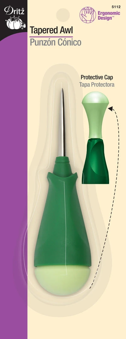 Stitch and sew comfortably with the Dritz Ergonomic Tapered Awl. This package contains one tapered awl that is designed to eliminate stress and strain on your hand and wrist. It features a soft cushion cap that gives support to the hand and protects the point when not in use. Use this handy tool to punch holes in a variety of materials or to enlarge existing holes. You can also use this tapered awl to sew heavy materials like leather or canvas.