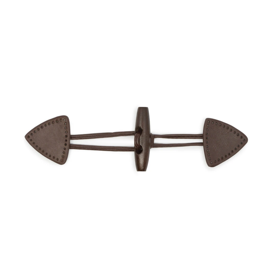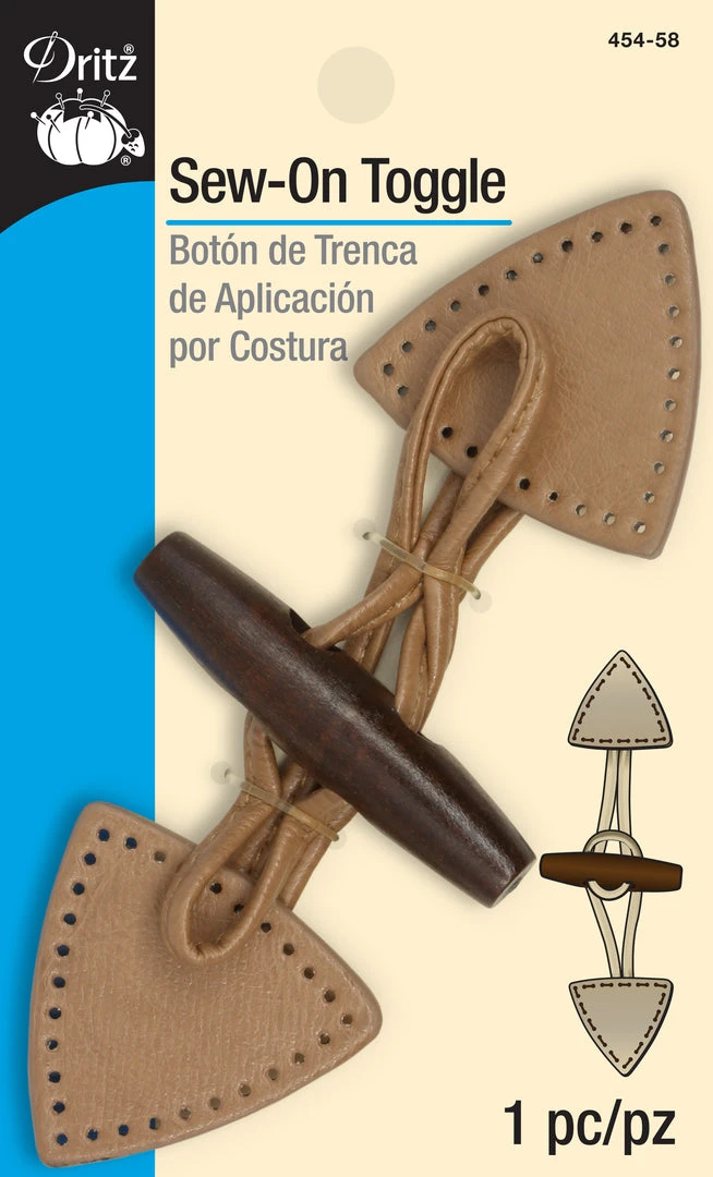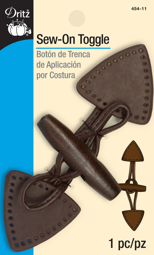This Dritz sew-on toggle is a faux leather fastener with a wooden button and pre-punched stitching holes; it can be quickly and easily hand sewn onto a variety of garments and accessories.