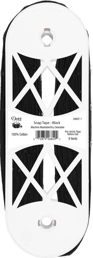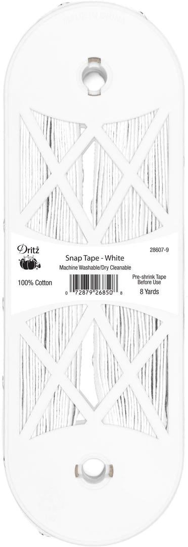 The Dritz Snap Tape is ideal for infants’ and children’s clothing, shirt closures, pillows and duvet covers. This snap tape contains 12 snaps that are 1-1/2 inch apart. It is 100% cotton and washable and dry cleanable.