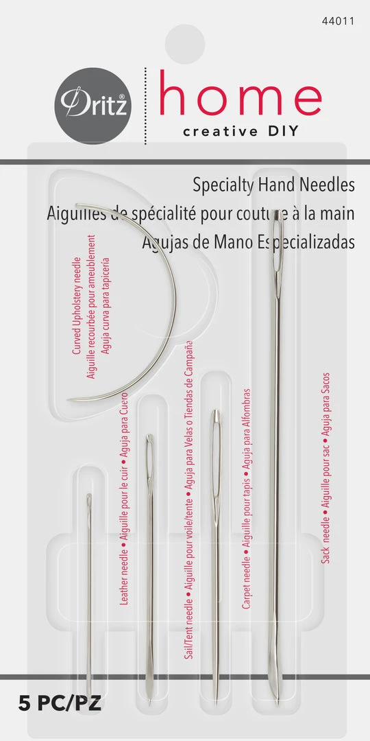 Dritz Home Specialty Hand Needles are for a variety of home décor sewing and repair needs. Includes 1 Curved Upholstery Needle, 1 Leather Needle, 1 Sail/ Tent Needle, 1 Carpet Needle, & 1 Sack Needle.
