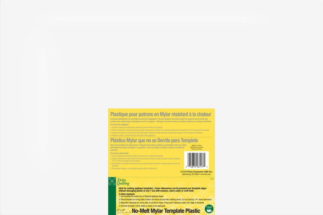 This Dritz No-Melt Mylar Plastic Template is ideal for making applique, patchwork or quilt templates. It is constructed out of durable, no melt material in which seam allowances can be pressed over template edges without damaging the plastic or iron. Cut with scissors, rotary knife or craft knife. The pack includes one 12 x 18-inch No-Melt Mylar Plastic Template.