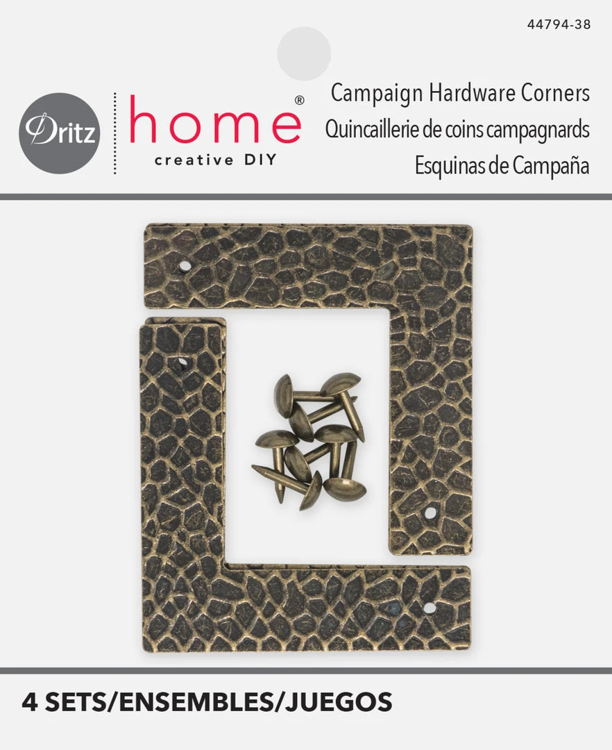 Dritz Home campaign hardware is decorative non-functioning hardware that is applied to the surface of woodworking projects to give them a professional finish – simply nail it into place using the provided nails. This “L” shaped hardware can be aligned in the corners of furniture pieces or accessories, but it can also be artfully arranged to create interesting surface patterns and designs. Campaign hardware is ideal for a variety of DIY projects such as drawers, chests, trays, boxes, mirrors and more.
