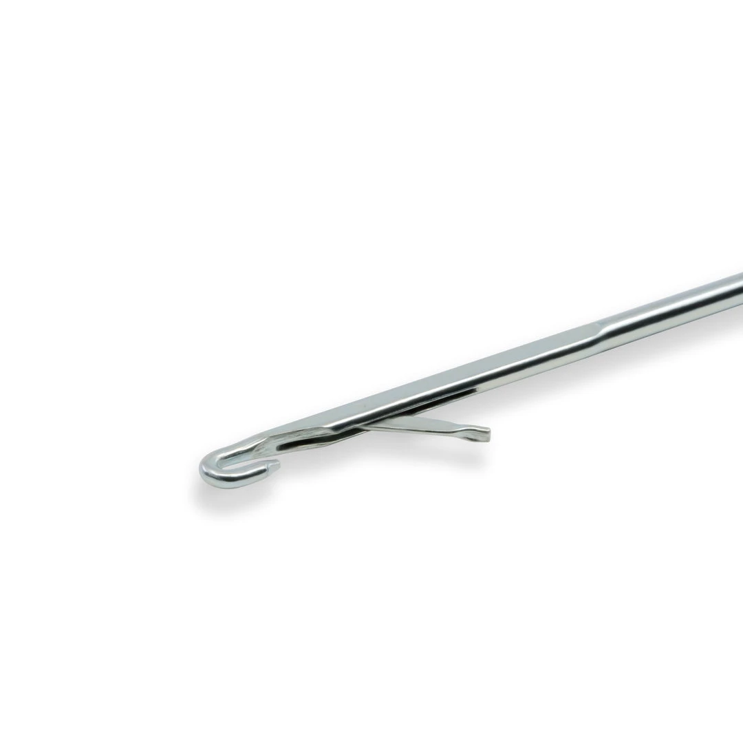 - Made of wire, hooked end grabs and hangs on to fabric as you pull