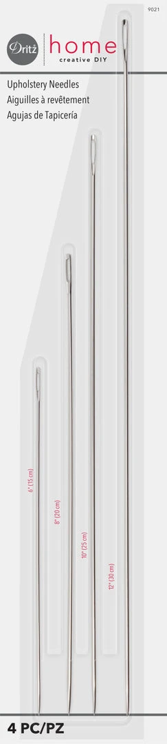 Dritz Home Long Straight Upholstery Hand Needles make it easier to tie springs to webbing, stitch edges and sew through padding. This pack features 10 and 12 inch needles to tuft, attach buttons and secure spring bottoms to webbing. These upholstery needles are available as 4 pieces in a single pack.