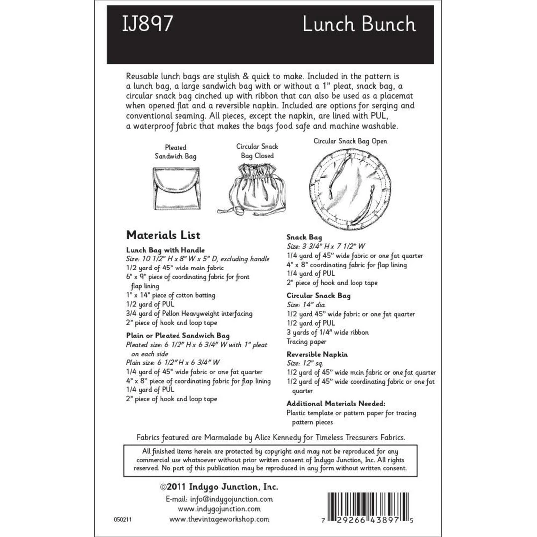Included in the pattern is a lunch sack, a large sandwich bag with or without a 1″ pleat, snack bag, a circular snack bag cinched up with ribbon or cord that can also be used as a placemat when opened flat (approx. size 14″ dia.) and a reversible napkin. Included are options for serging and conventional seaming. All pieces are lined with PUL, a waterproof fabric that makes the bags food safe and machine washable.