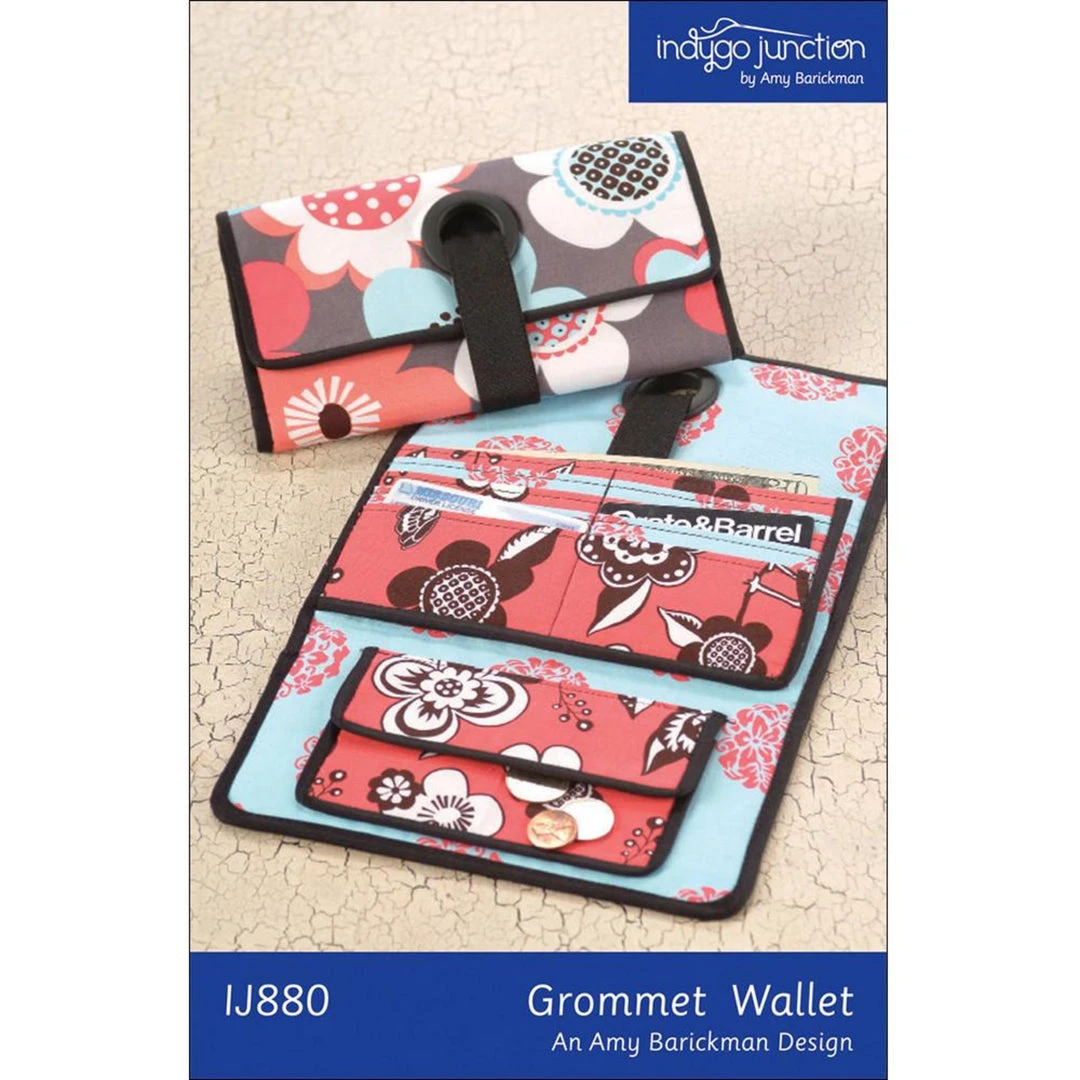 Create a sleek and fashionable billfold style wallet with a grommet & elastic closure. Keep organized with eight separate card pocket dividers. A larger area located behind the card storage provides a place for paper money and a divider for receipts; while the Velcro closed smaller pocket is perfect for coins. Create with two coordinating cottons and finish edges with purchased bias binding. Approximate finished size: closed is 4-1/2″ x 8″ wide and open is 12-3/4″ x 8″ wide.