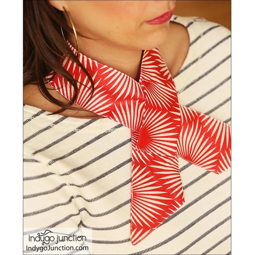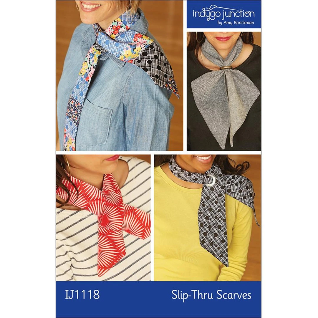 Bring sophistication to your style with one of four slip-thru scarves. Strip piece your favorite prints to create View A and use a buttonhole for the pass-thru. View B has a pleated flair that is held together with a curtain grommet. View C is a simple style that features a grommet pass-thru and View D is a shorter style that slips through a fabric casing.