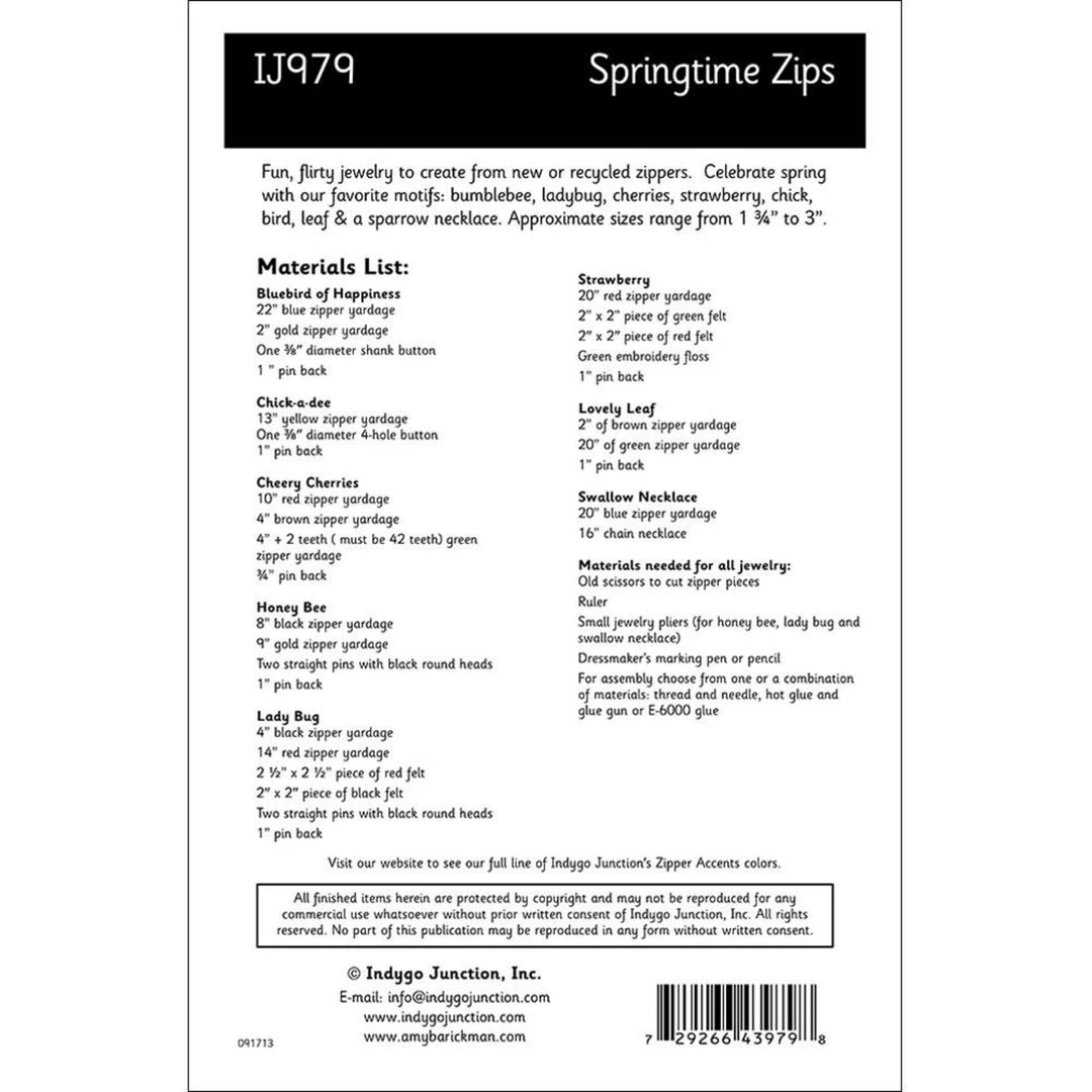Fun, flirty jewelry to create from new or recycled zippers. Celebrate spring with our favorite motifs: bumblebee, ladybug, cherries, strawberry, chick, bird, leaf & a sparrow necklace. Approximate sizes range from 1-3/4″ to 3″.