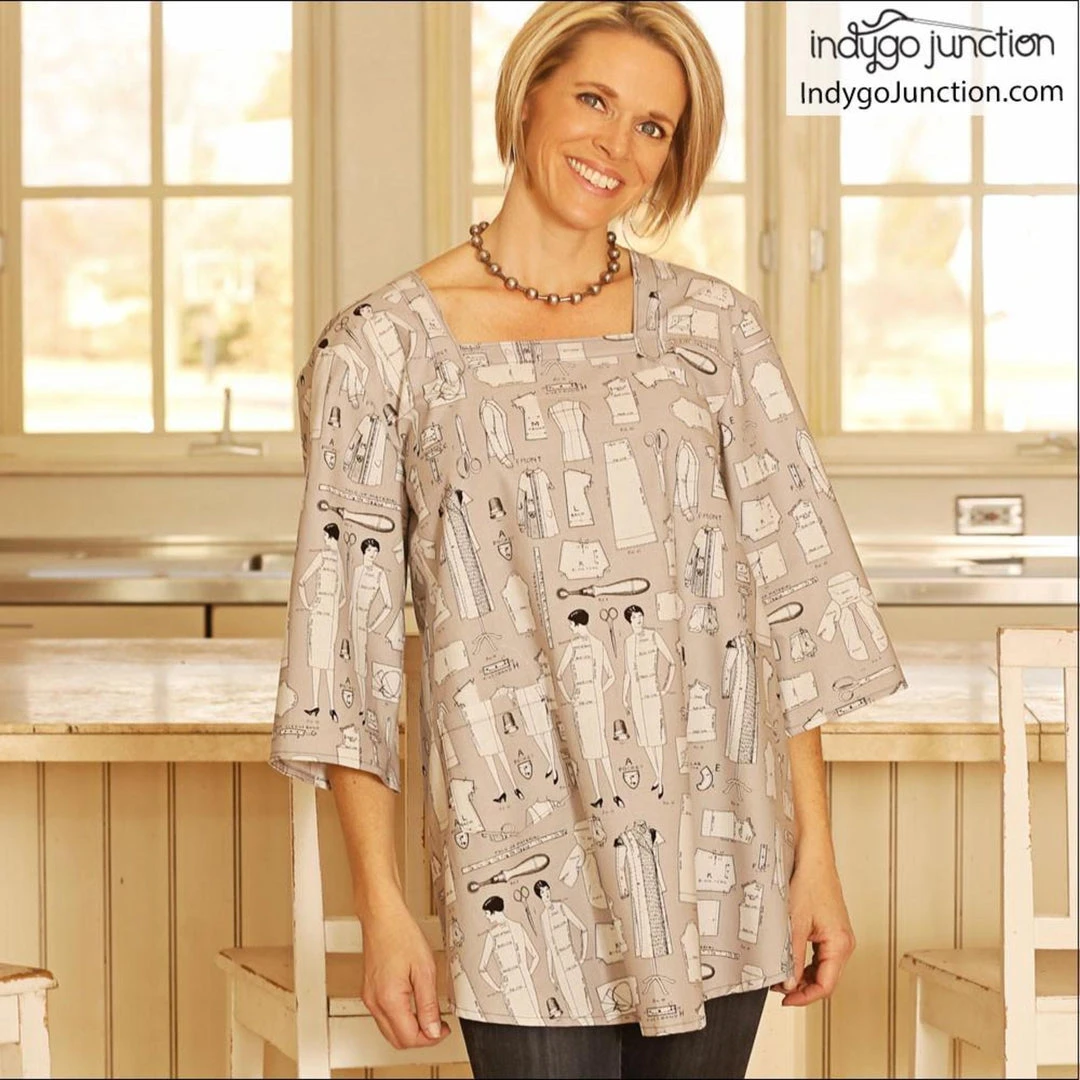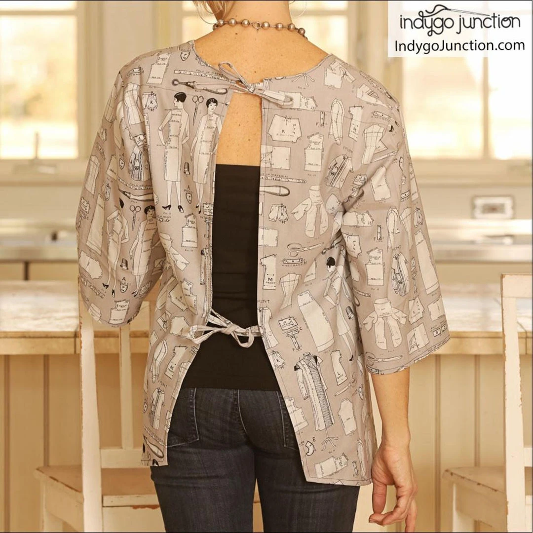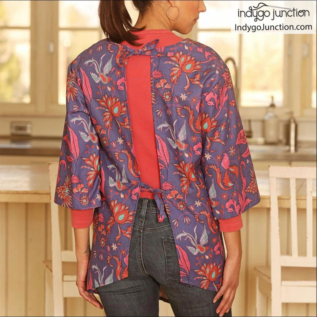 This easy-to-construct style features a square neckline & curved hem. Two ties secure back for a comfortable fit. 3/4 sleeves make this the perfect coverall for cleaning, gardening or everyday fashion. Sizes: XS-3XL.