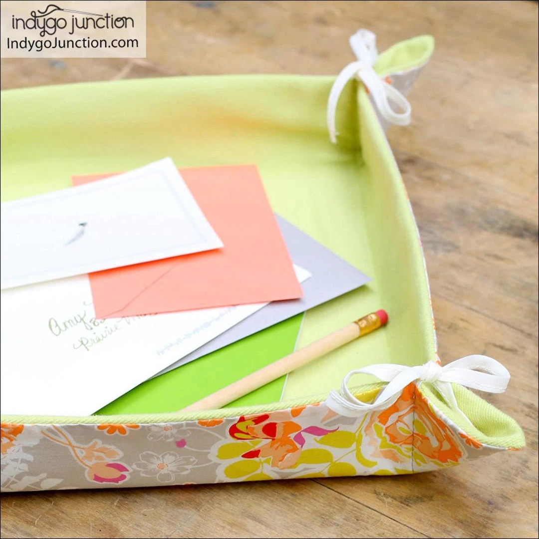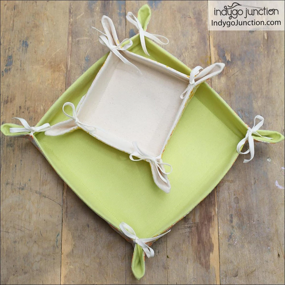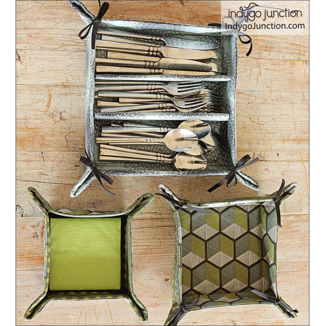 Keep things neat with our quick and easy fabric tray set. Great as a kitchen set: napkin holder for dinner or cocktail size napkins and add divider to large tray for silverware holder. Three sizes are included along with tie or snap corner closures. Small: 5″ x 5″ x 2.5″; Med: 6.5″ x 6.5″x 2.5″; Large: 9.5″ x 9.5″ x 2.5″.