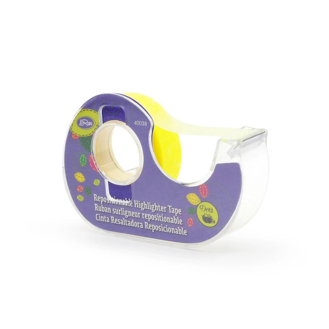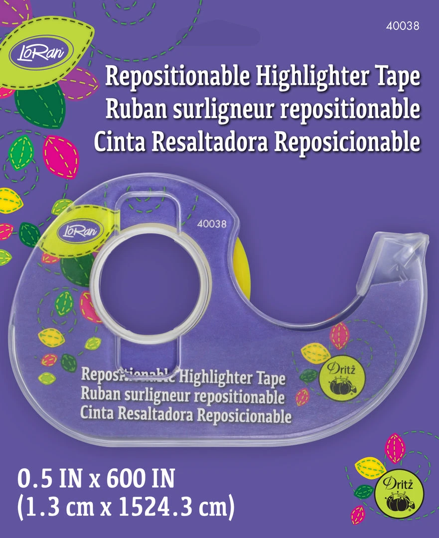 LoRan Repositionable Highlighter Tape is used to temporarily hold papers, stitchery books, patterns and charts in place while work is in progress. Easily remove or reposition tape without damaging most papers, stitchery books, patterns, charts and more.