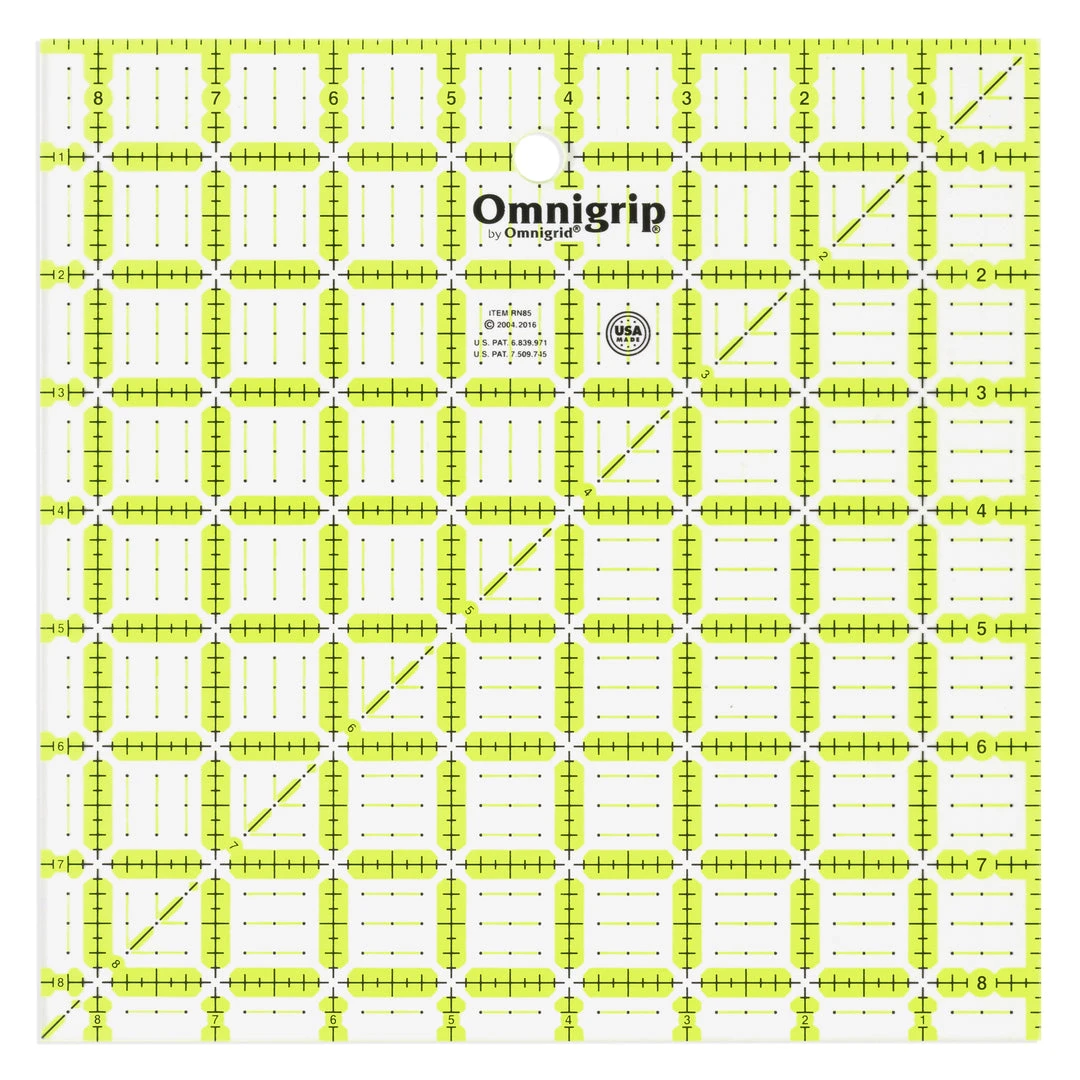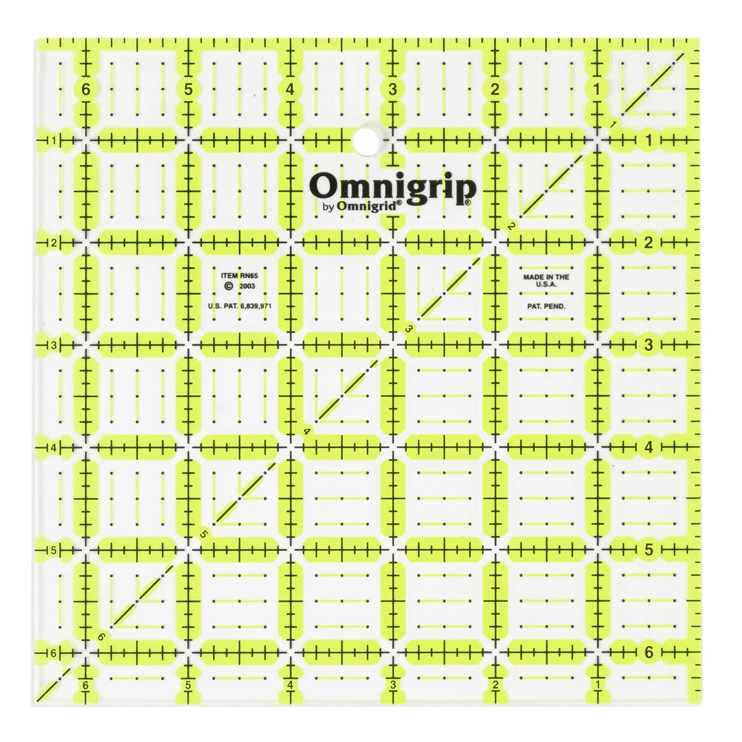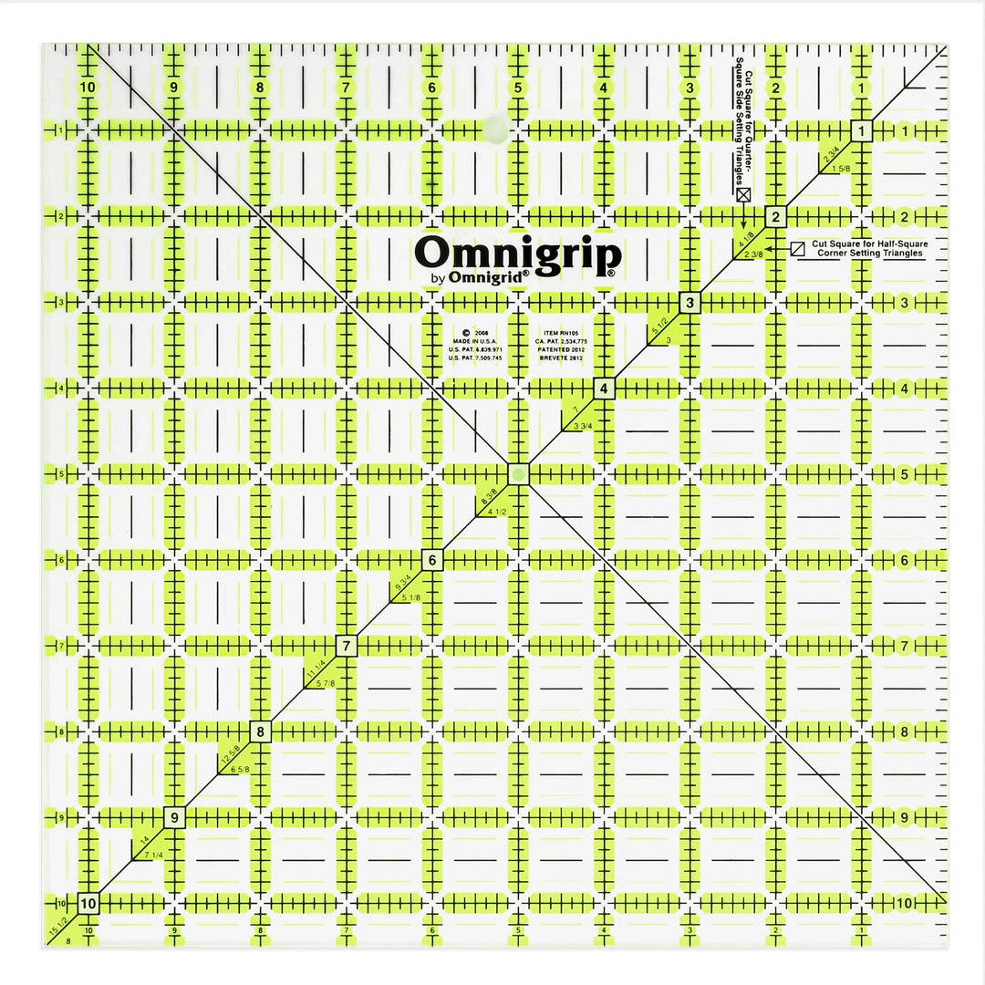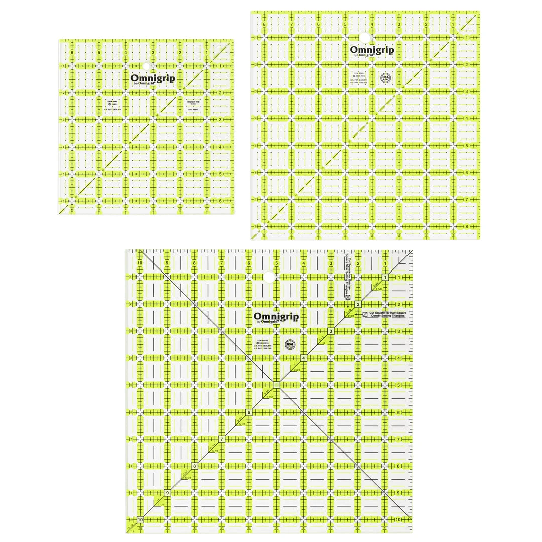 The Omnigrip square value pack from Omnigrid contains one each of 3 square Omnigrip quilting rulers (6-1/2″, 8-1/2″ and 10-1/2″); each has an extra 1/2″ for seam allowances and diagonal angle lines; use them to cut, square and trim blocks.
