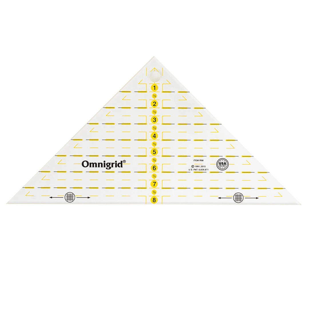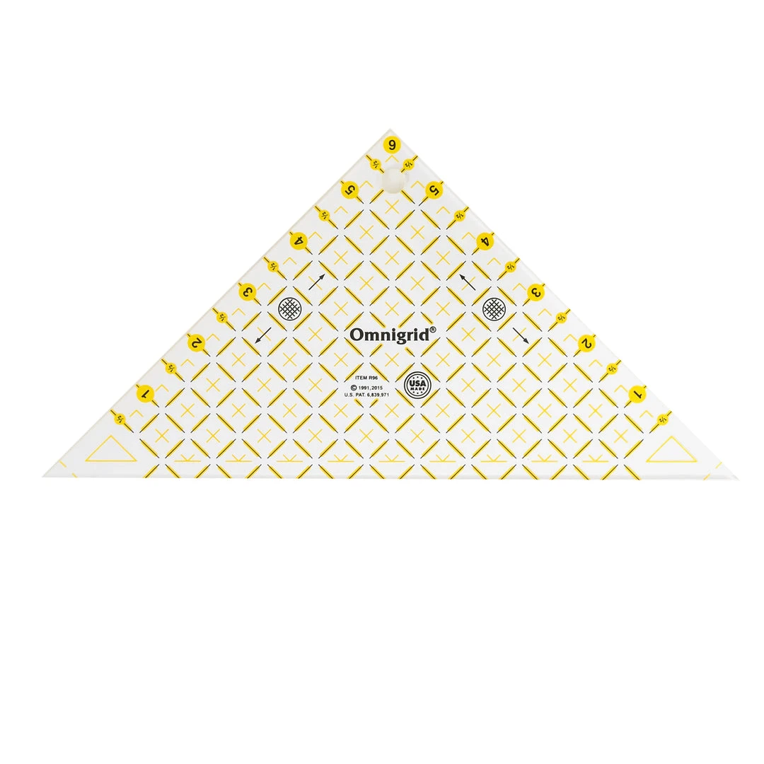 The Omnigrid square triangle ruler is used to create quarter and half square triangles for finished quilt blocks; it has seam allowance calculations included in the measurements.