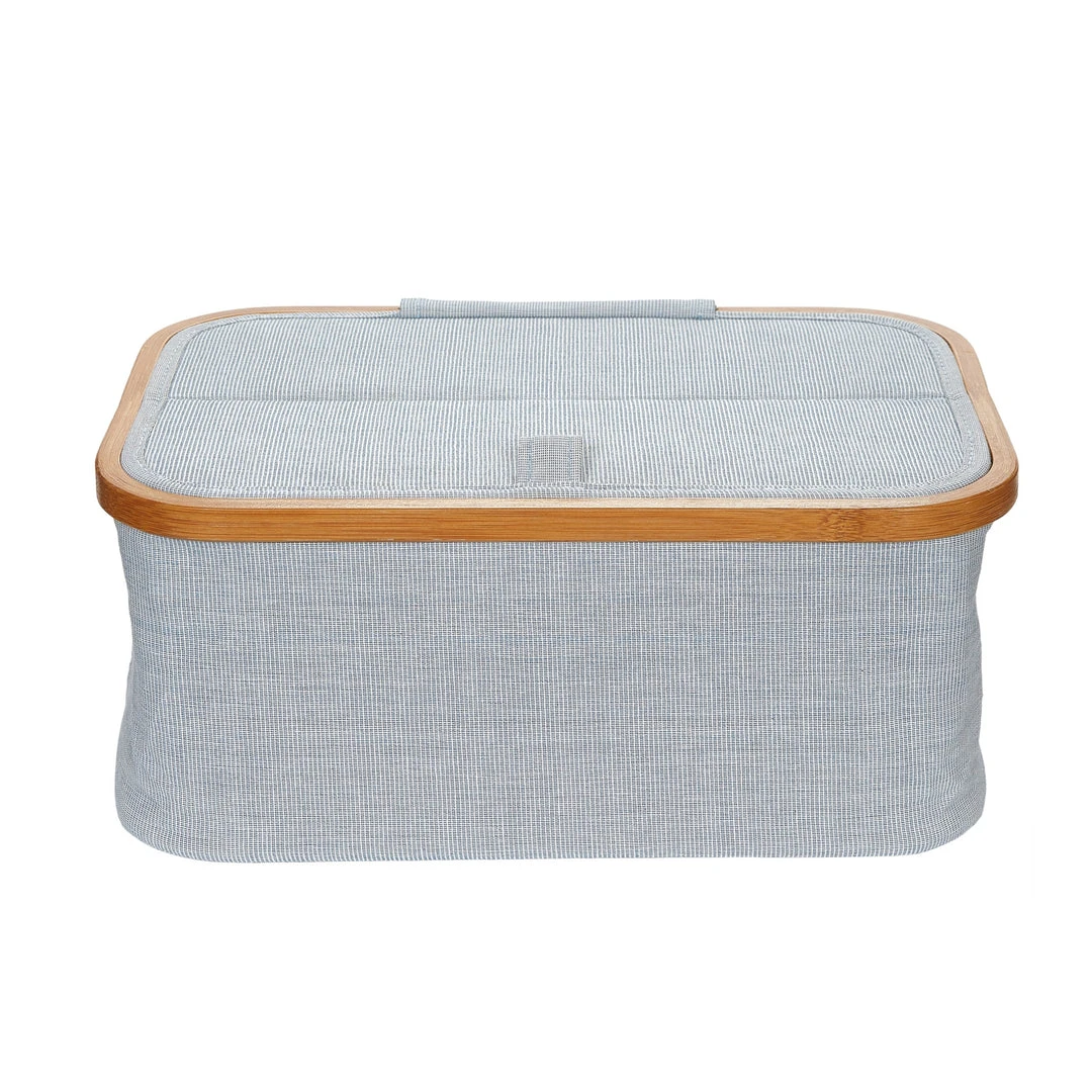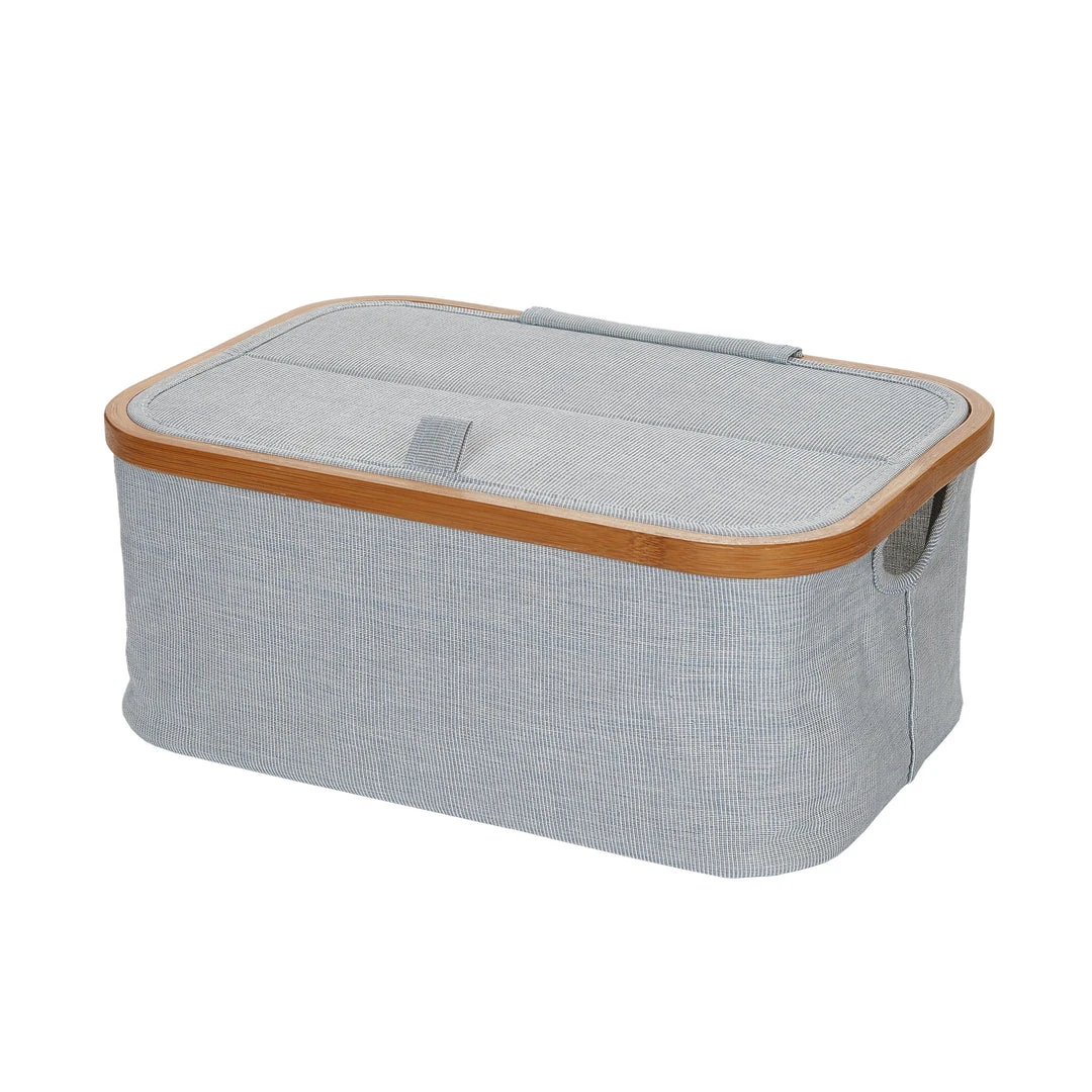 Fold & Store Box folds down for storage or can be built to hold sewing, quilting, and needlecraft projects. Its reinforced base allows it to be stacked for more storage options. The lid is secured and can be opened halfway for quick access to stored items or opens completely for full access. Simply build box by pushing attached internal bars under the bamboo frame and securing with hook and loop tabs. Use side openings to carry or grab box.